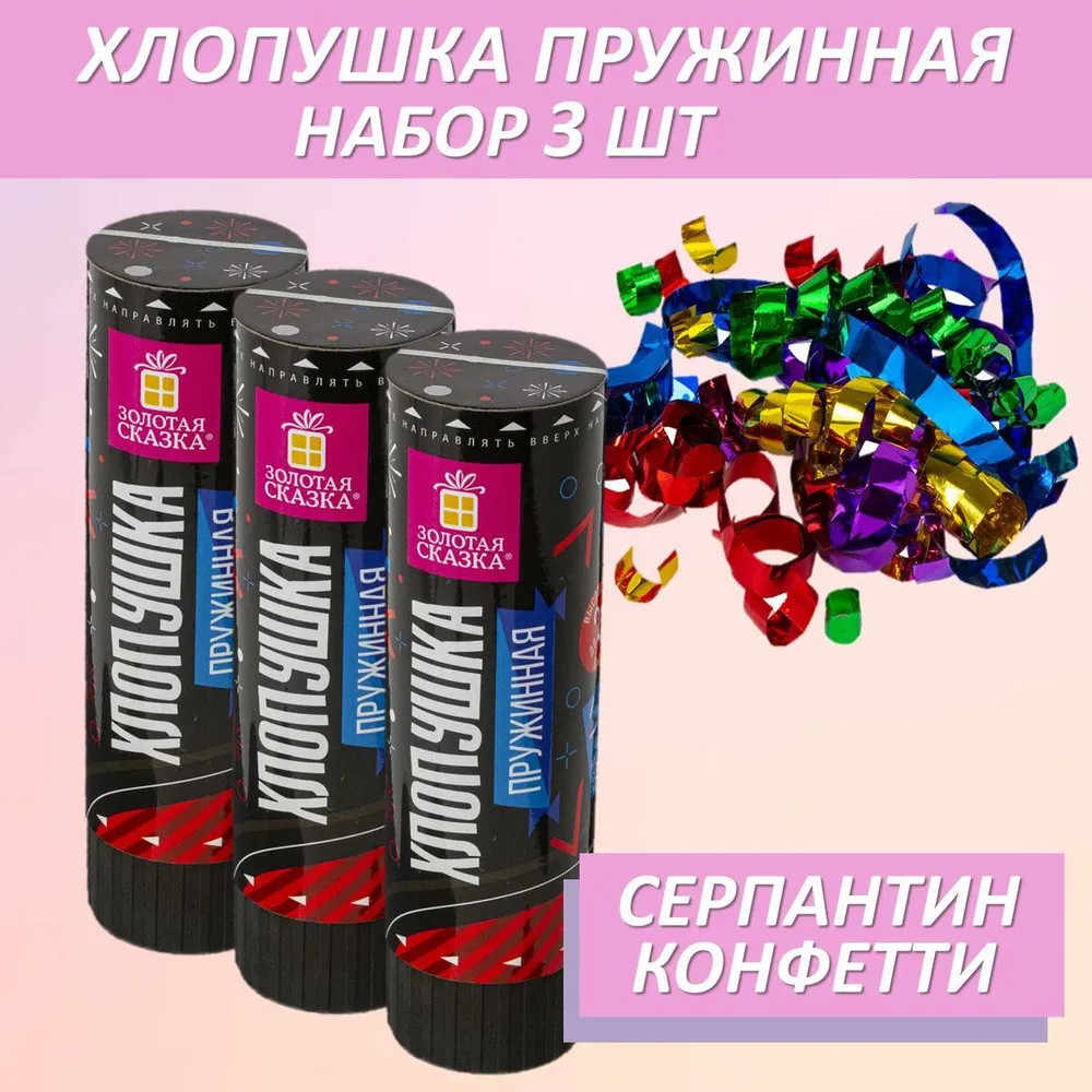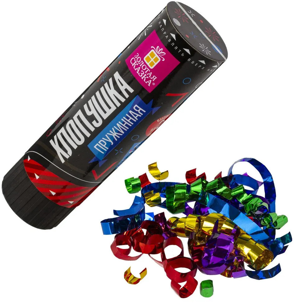 Золотая сказка Набор хлопушекВ данный момент этот товар отсутствует в продаже. Возможно, у нас найдется аналогичный или похожий товар здесь. Пружинная хлопушка «Золотая сказка» предназначена для создания отличного настроения и атмосферы настоящего веселья на любом празднике. Хлопушка высотой 15,5 см с фольгированным наполнителем в виде серпантина и конфетти цвета ассорти является абсолютно безопасной, так как действует на основе пружинного механизма. Не является пиротехникой. Средняя дальность выстрела — 2-3 м. Хлопушка может быть использована как внутри помещений, так и на улице. Создайте фейерверк из серпантина и конфетти с помощью хлопушки золотая сказка! Подарите яркое настроение всем гостям! |