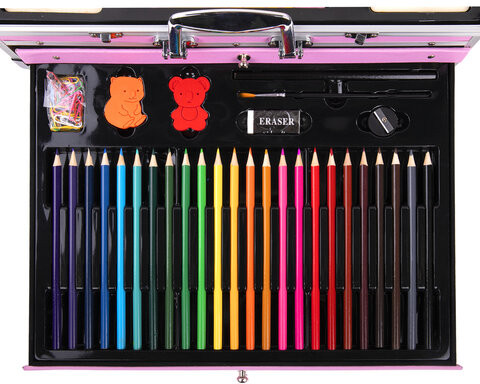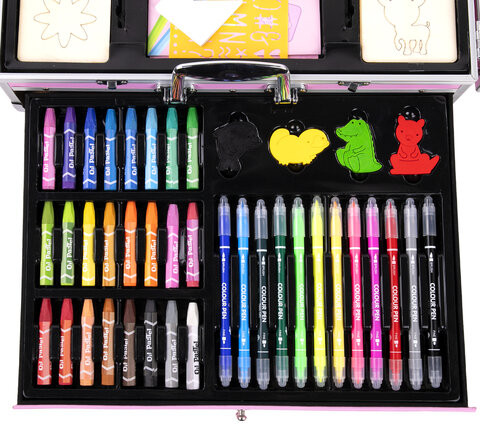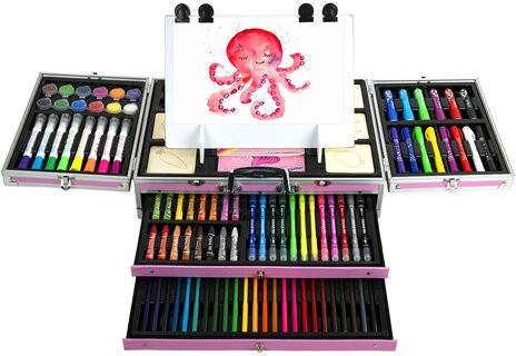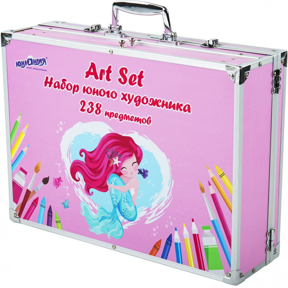Набор представляет собой кейс с красочным дизайном и грамотно подобранным наполнением из 238 предметов для рисования. Кейс раскладывается как книга и имеет два выдвижных элемента на боковой части корпуса. Каждый предмет надежно закреплен в ячейке. Прочный алюминиевый корпус кейса гарантирует полную защиту внутреннего наполнения от повреждений. Набор надежно упакован в термоусадку, воздушно-пузырчатую пленку и короб из гофрокартона. Углы кейса дополнительно защищены от повреждений при транспортировке. Набор можно брать с собой в школу или в любые поездки.