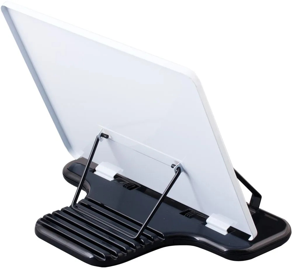 Регулируемый наклон подставки позволяет комфортно разместить книгу, журнал, или учебник на рабочем месте в вертикальном положении, обеспечивая удобство при чтении и работе с текстом. Пластина сделана из металла и способна удержать даже увесистые книги. Пластиковые держатели зафиксируют книгу снизу на выбранной странице.