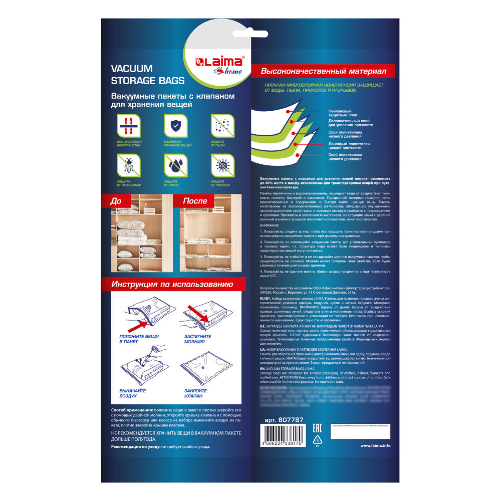 Вакуумные пакеты с клапаном Laima Home для хранения вещей предназначены для герметичной упаковки одежды, подушек, одеял и мягких игрушек. Помогут сэкономить до 80% места в шкафу, незаменимы при транспортировке вещей в путешествии и при переезде.