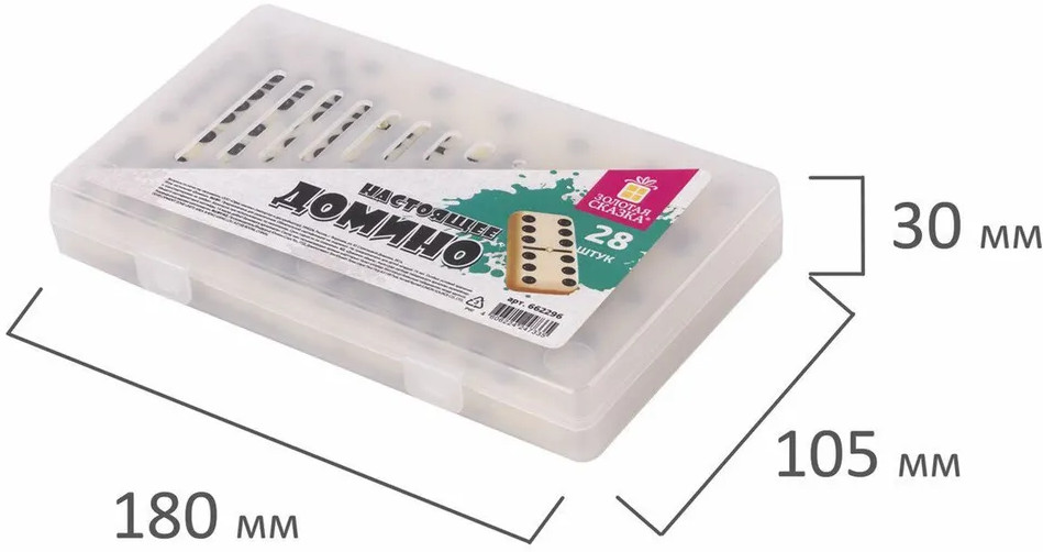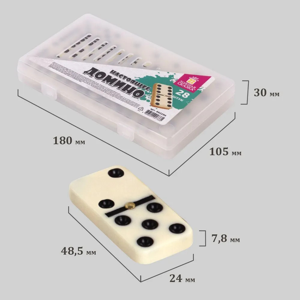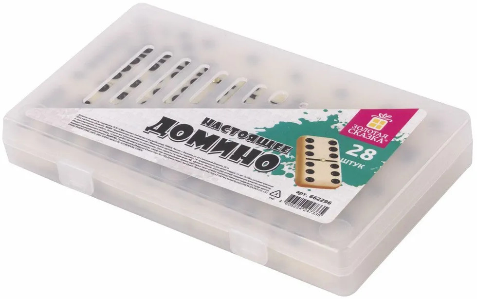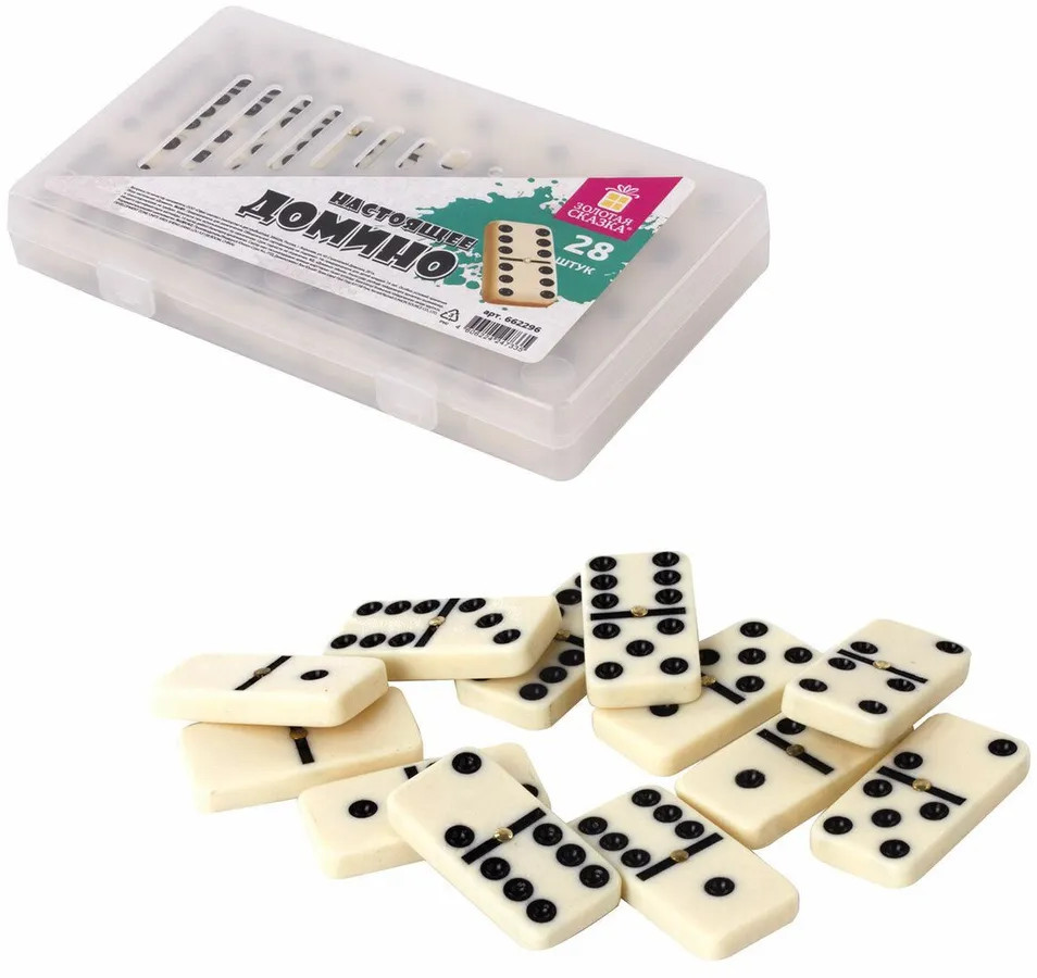 Настольная игра Золотая сказка «Домино» — хороший способ весело и интересно провести время в кругу семьи или друзей. Подходит как для семейных вечеров, так и для больших и шумных компаний. Настольная игра «Домино» — это современный вариант классической игры домино. В наборе 28 пластиковых костяшки белого цвета с черными точками, обозначающими комбинации чисел на двух полях. Размер костяшек — 48,5 × 24 × 7,8 мм. Правила игры стандартны, как в любом домино: игрокам раздаётся по 3-5 костяшек в зависимости от количества игроков. Начинает игрок, у которого есть дубль (комбинация одинаковых чисел с обоих сторон). После первого хода игроки выкладывают костяшки с соответствующими числами так, чтобы лежащие рядом числа совпадали. Если у игрока отсутствует нужная костяшка, он берёт её из резерва. Игра продолжается до тех пор, пока у одного из игроков не закончатся все костяшки. Игра «Домино» Золотая сказка — весёлое времяпровождение и оригинальный подарок!