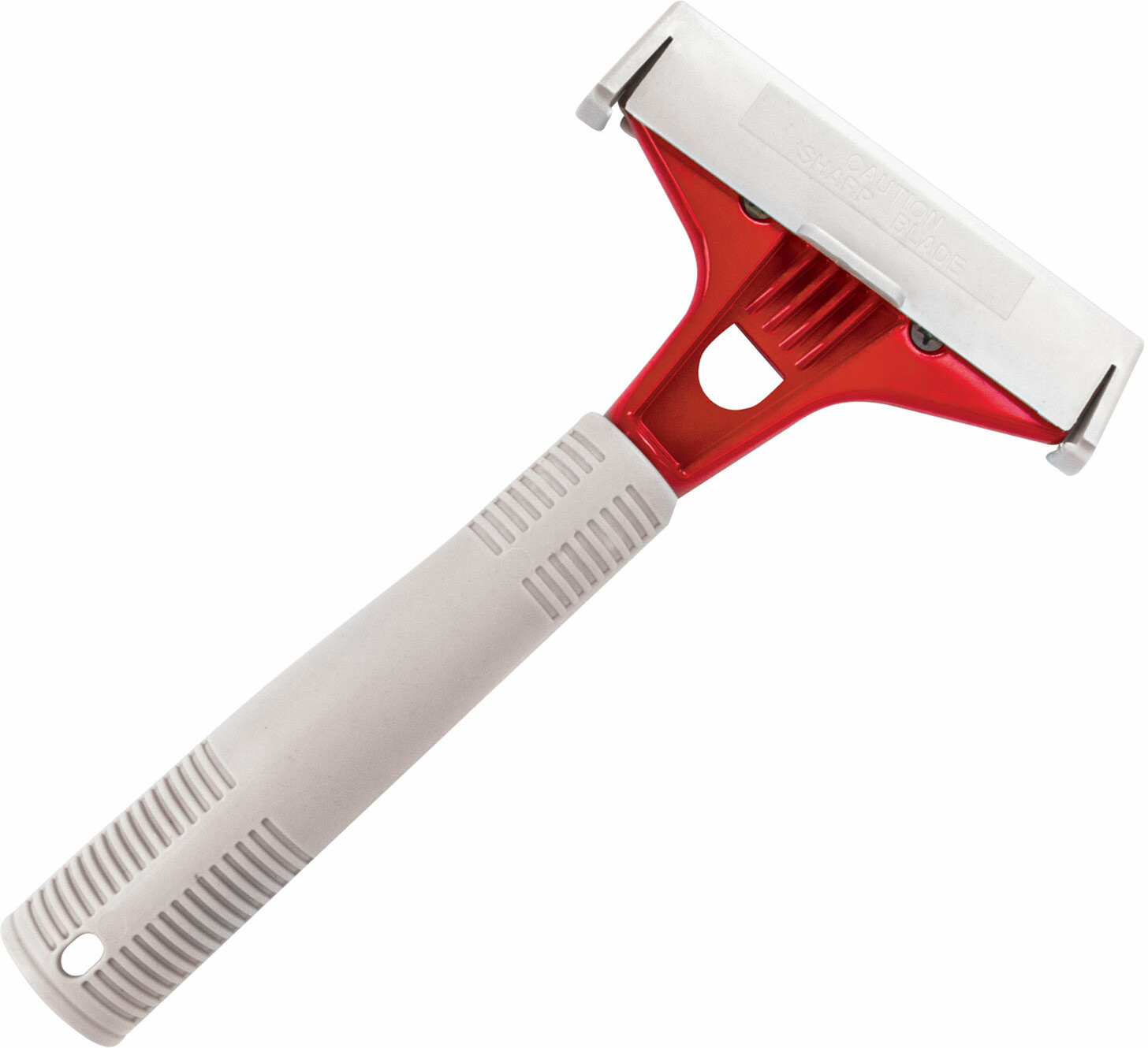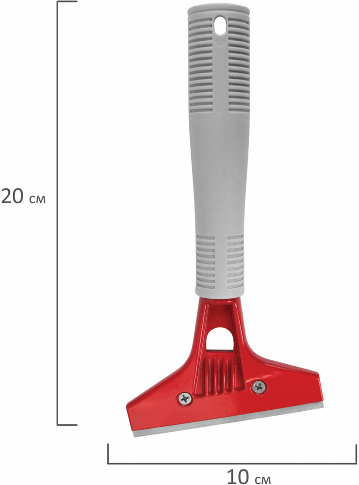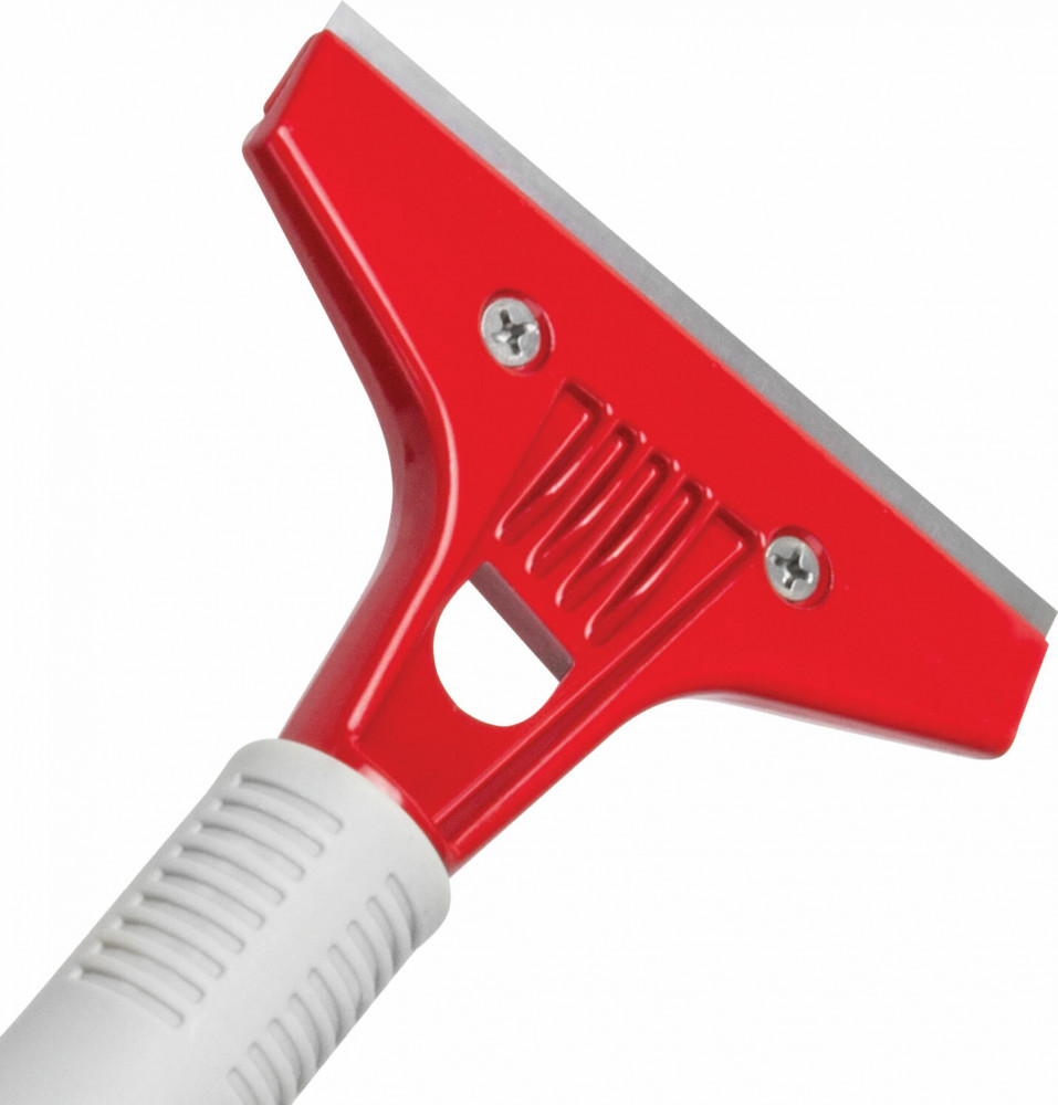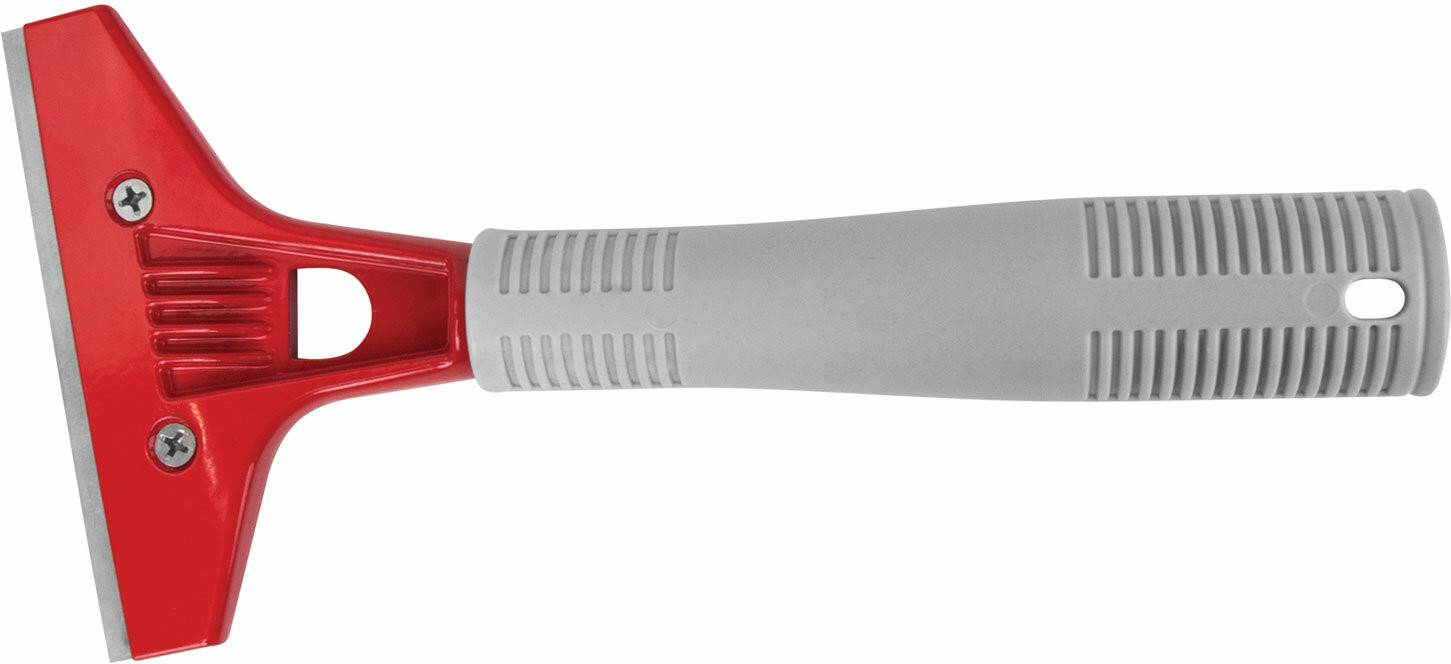 Подходит для чистки ламината, кафеля и т.д. Снабжен пластиковой ручкой и съемным чехлом, защищающим лезвие. Таким образом, производитель позаботился о двух уровнях защиты скребка: