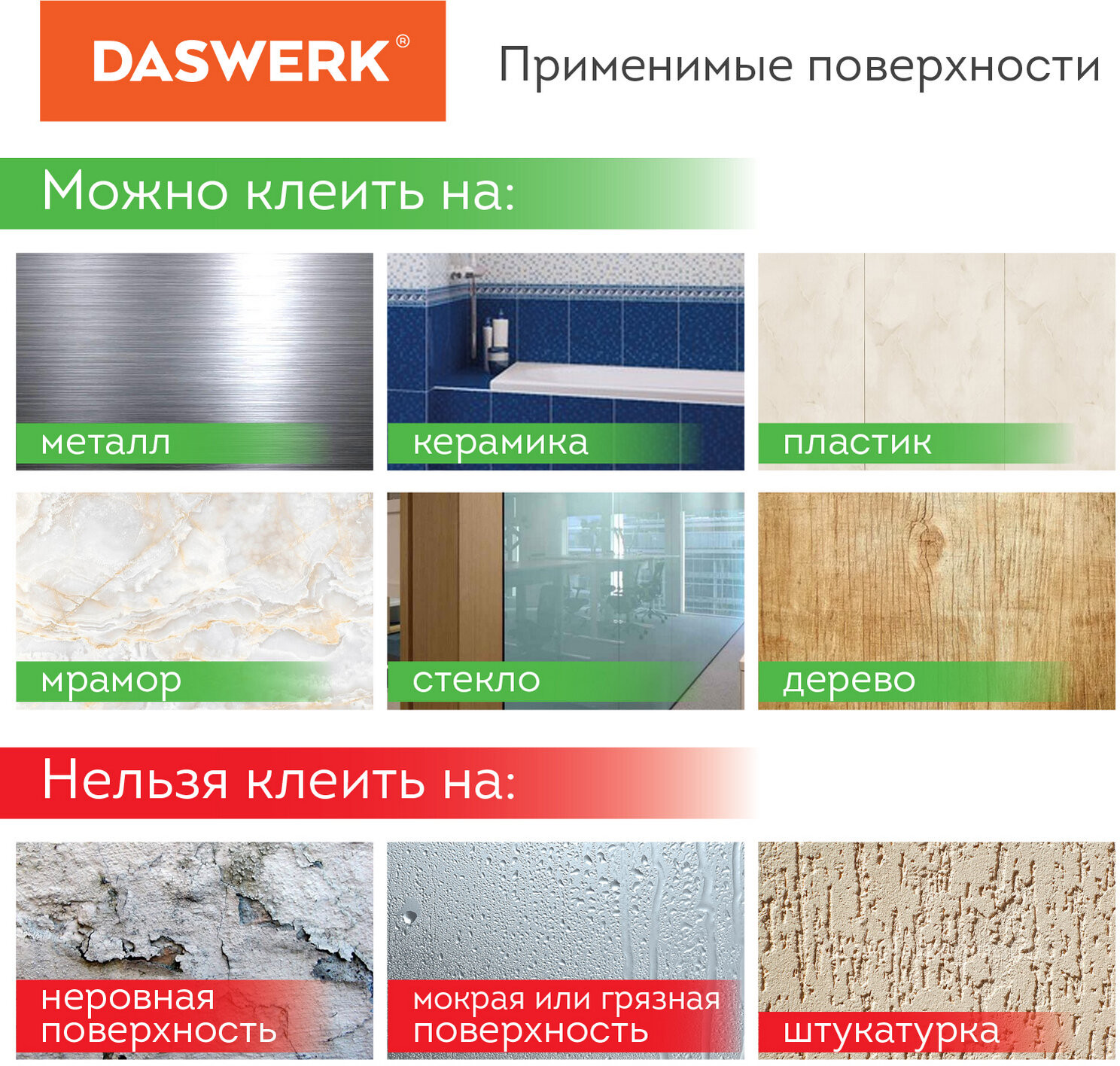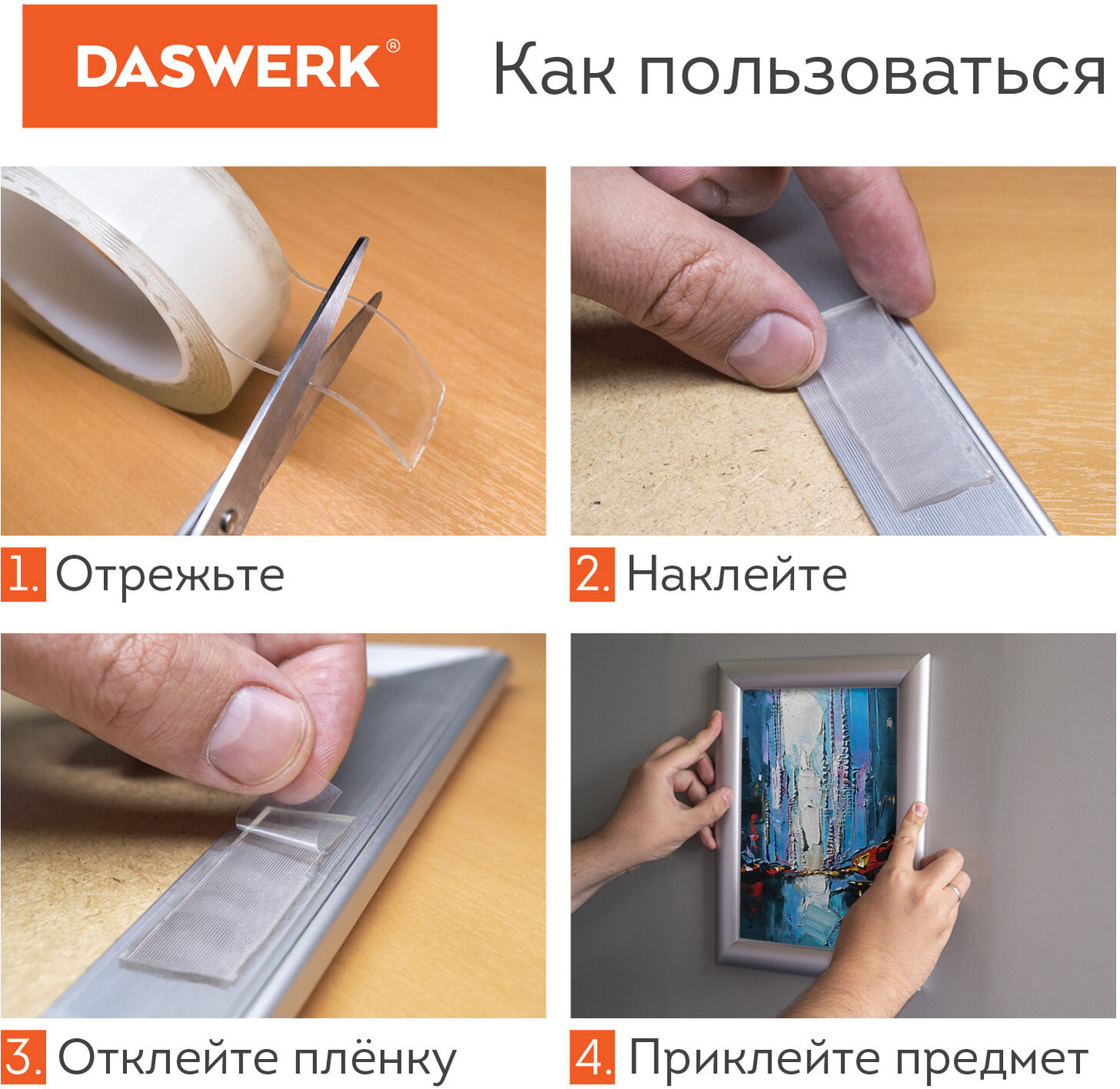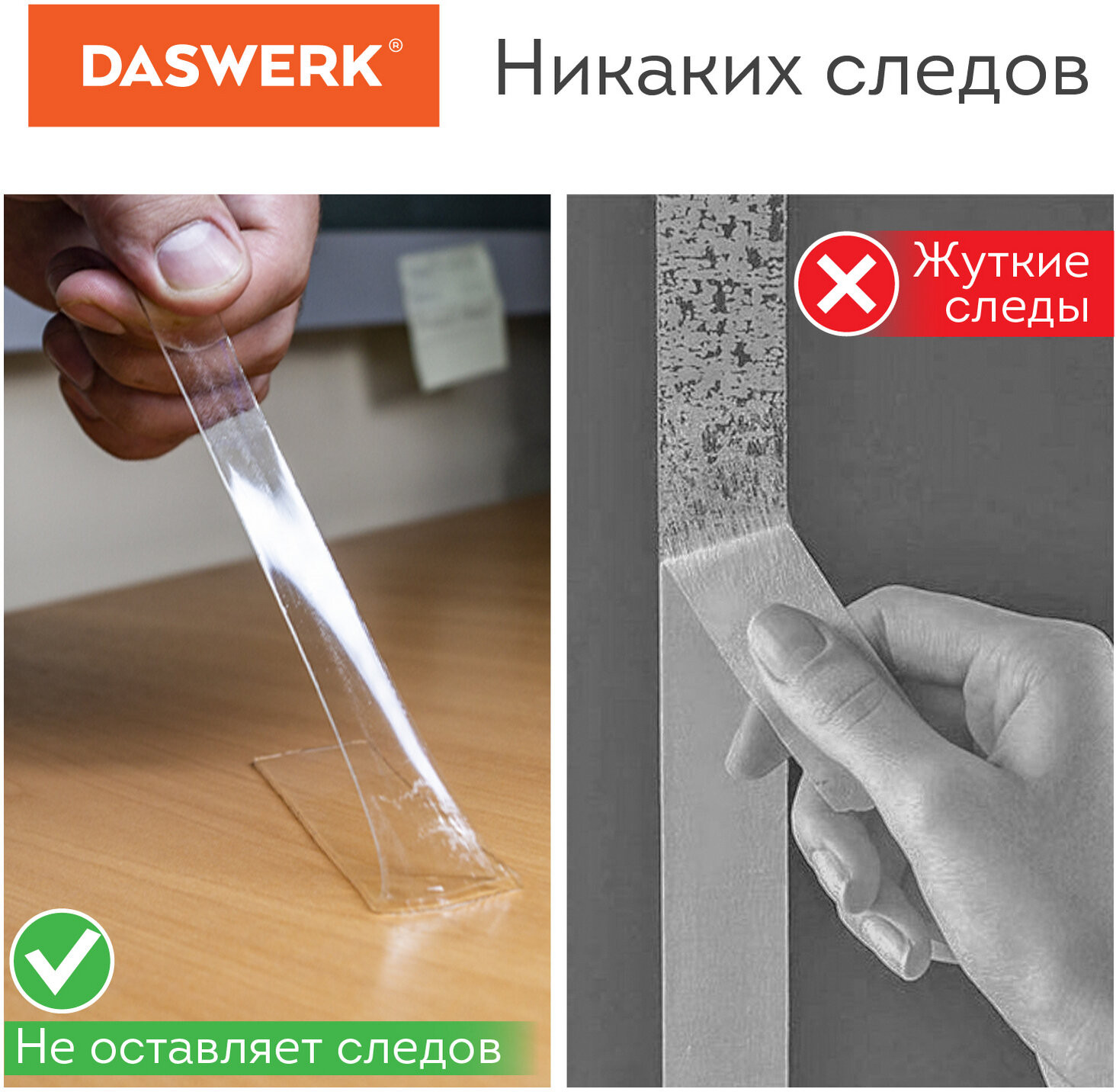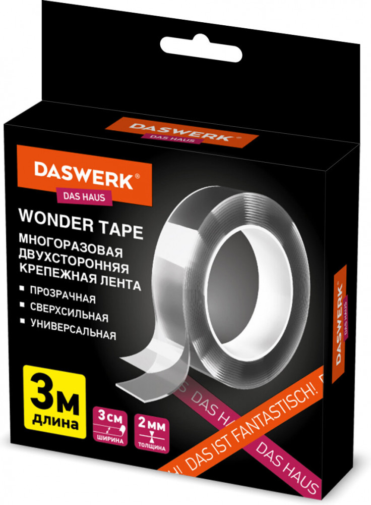 Многоразовая двухсторонняя крепежная лента Daswerk применяется для временной фиксации предметов и крепежа к различным типам поверхностей, в том числе прозрачным.