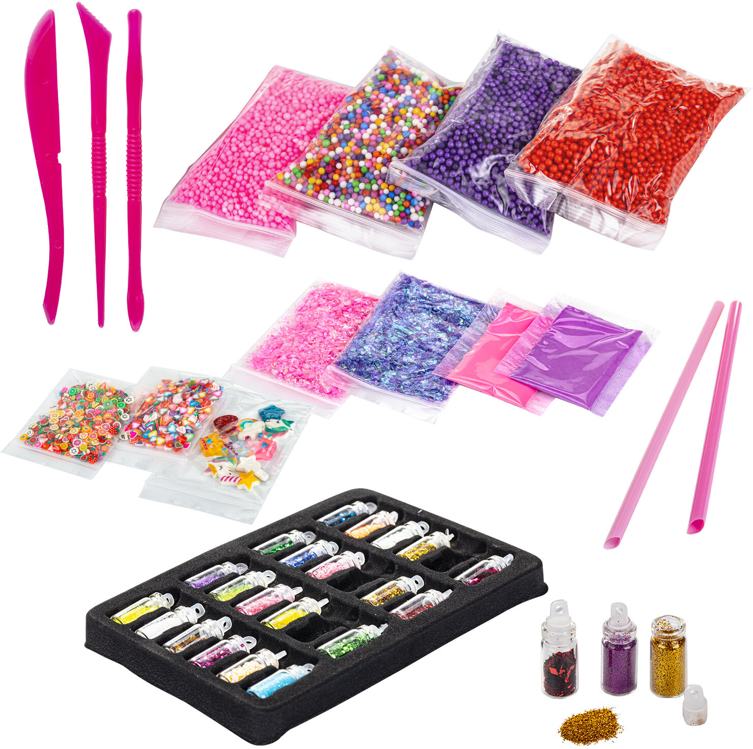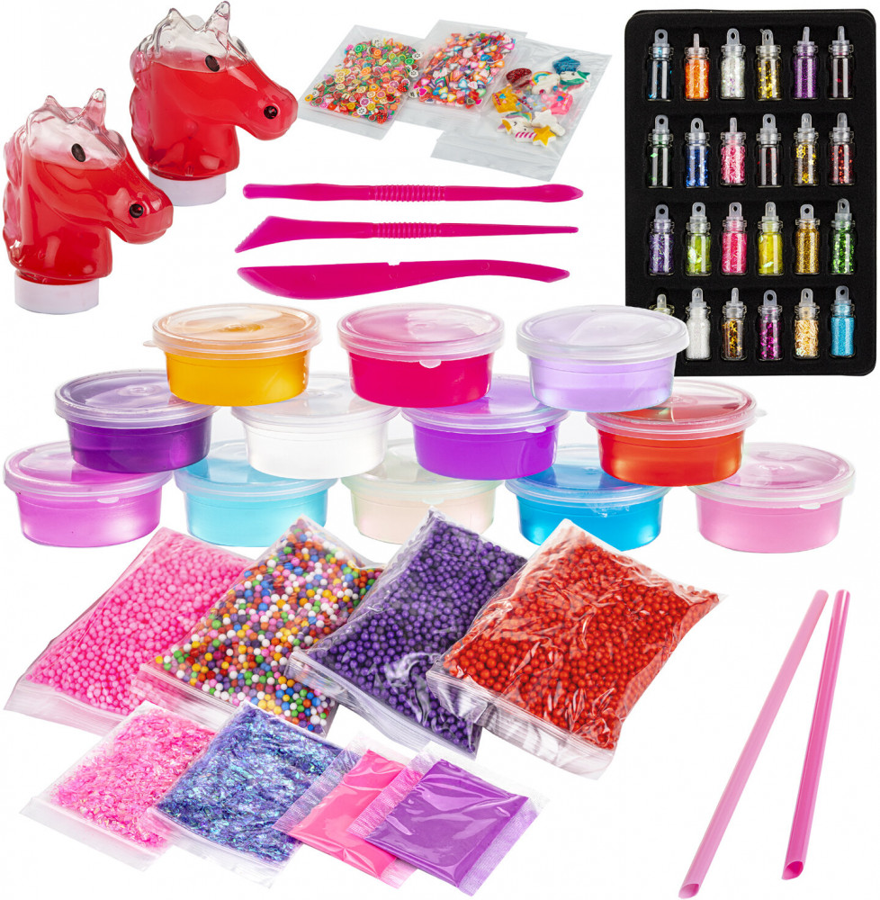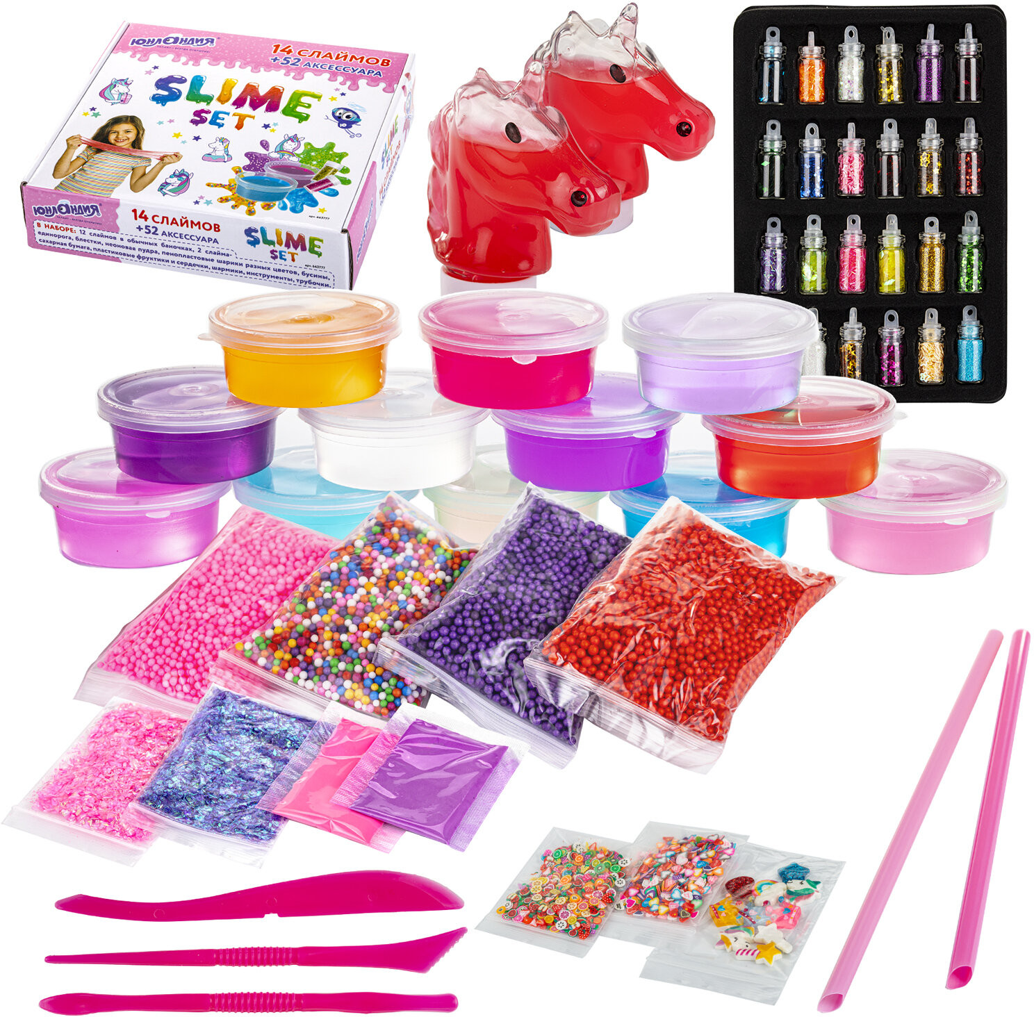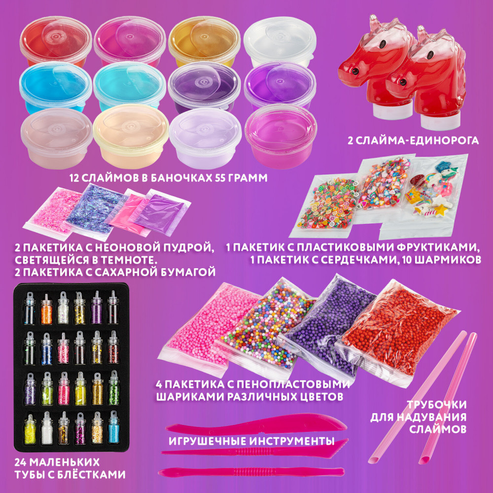 • 10 шармиков, а также игрушечные инструменты и трубочки для надувания слаймов.