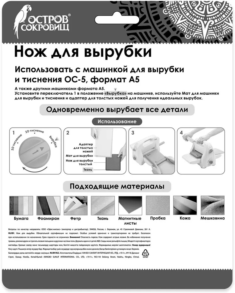 💳 Оплатить за товар можно при получении 🇰🇿 Есть бесплатная доставка по Казахстану от 1 дня 🎁 Копите бонусы с каждой покупки Серия: Толстые ножи для вырубки Ножи для вырубки Остров сокровищ — это пластины с мощными фигурными ножами, позволяющие легко и быстро создавать вырубки из множества различных материалов: картон, фоамиран, фетр, кожа, пробка и другие. Используются с машинкой для вырубки и тиснения ОС-5. |