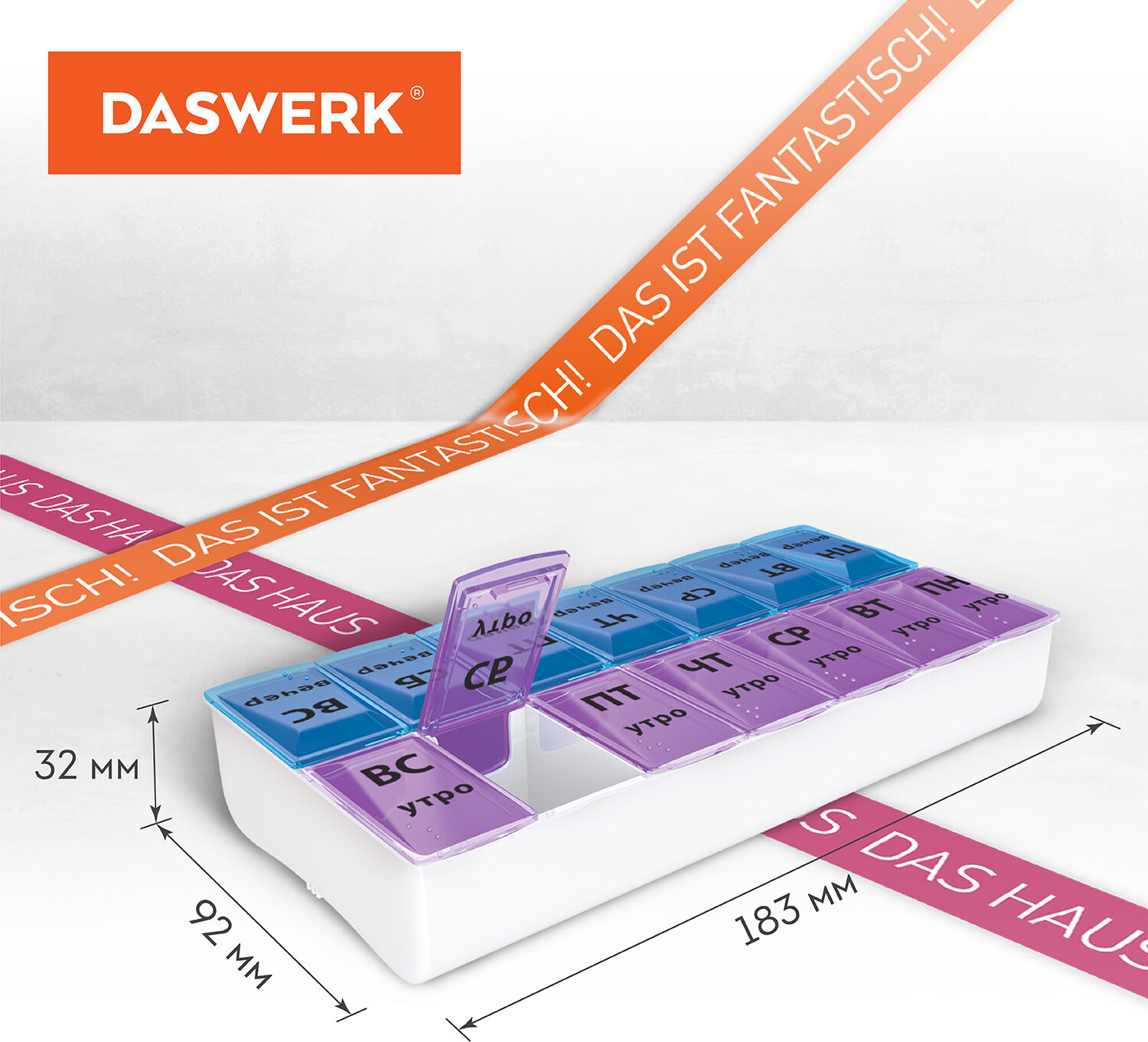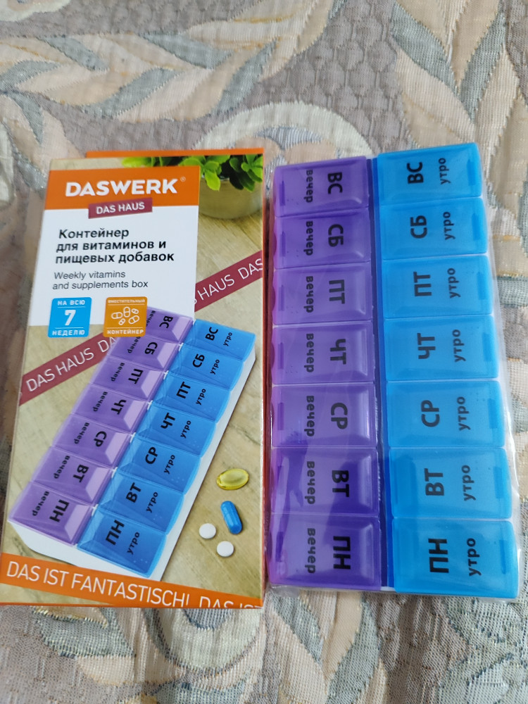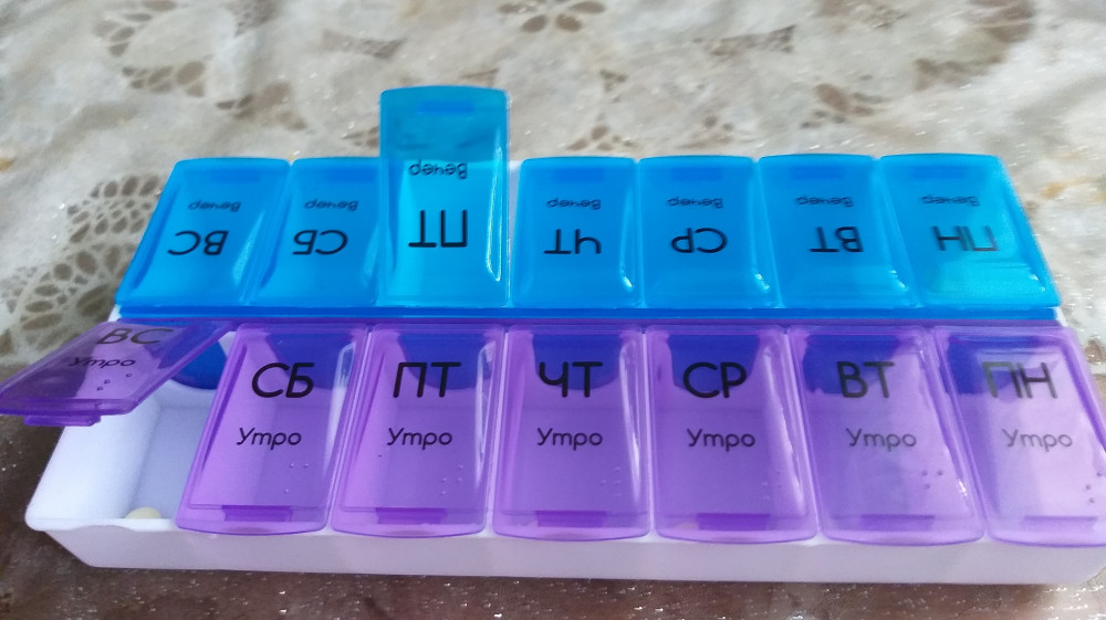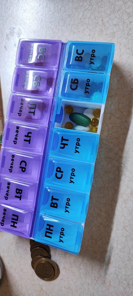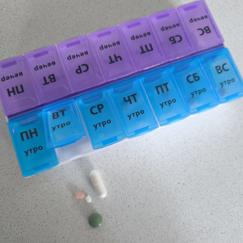 Удобный контейнер, когда нужно заранее разложить лекарства на всю неделю. Есть отделения "утор" и "вечер"