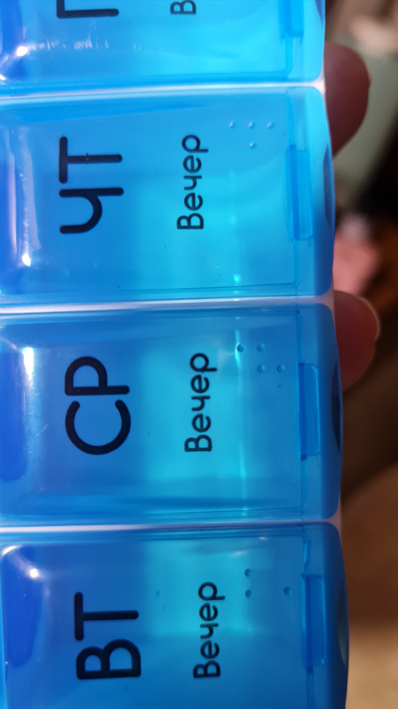 Отличная таблетница. большая.Ячейки глубокие. На неделю , утро и вечер можно разложить. на крышечках точки из азбуки Брайля есть.