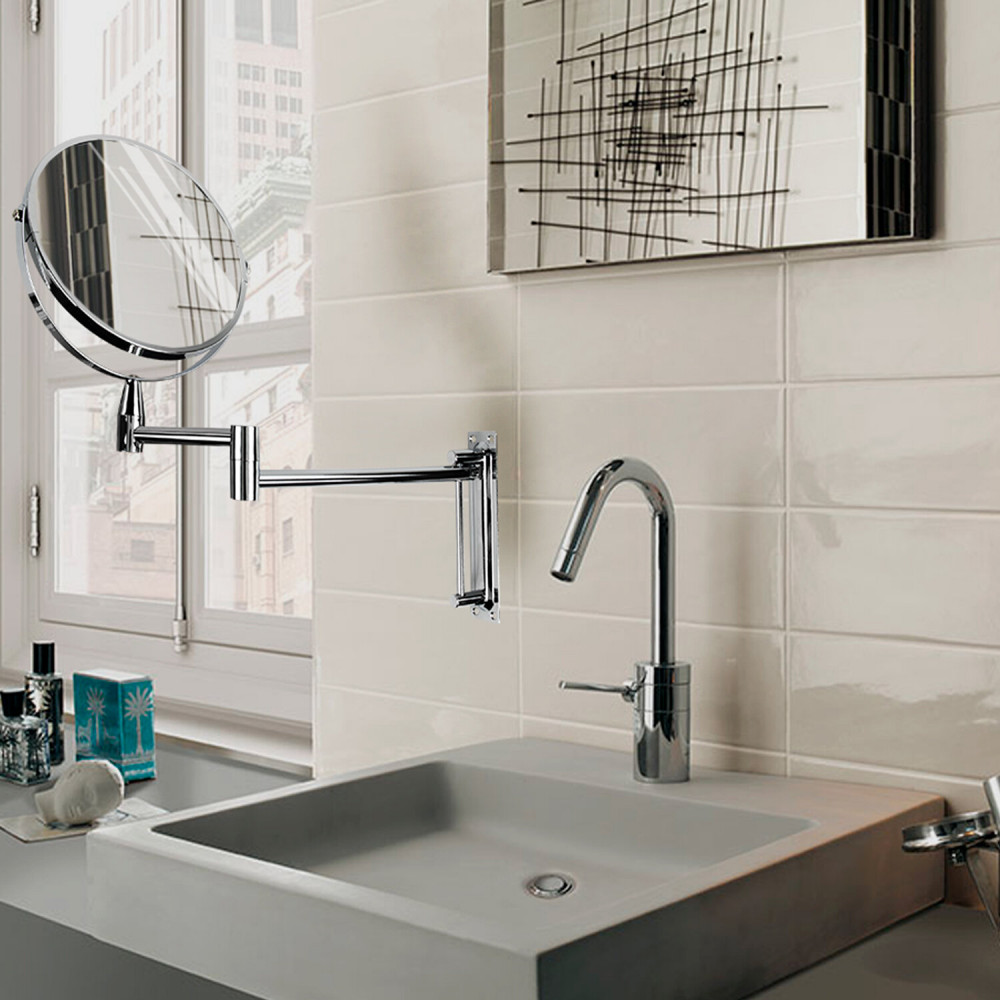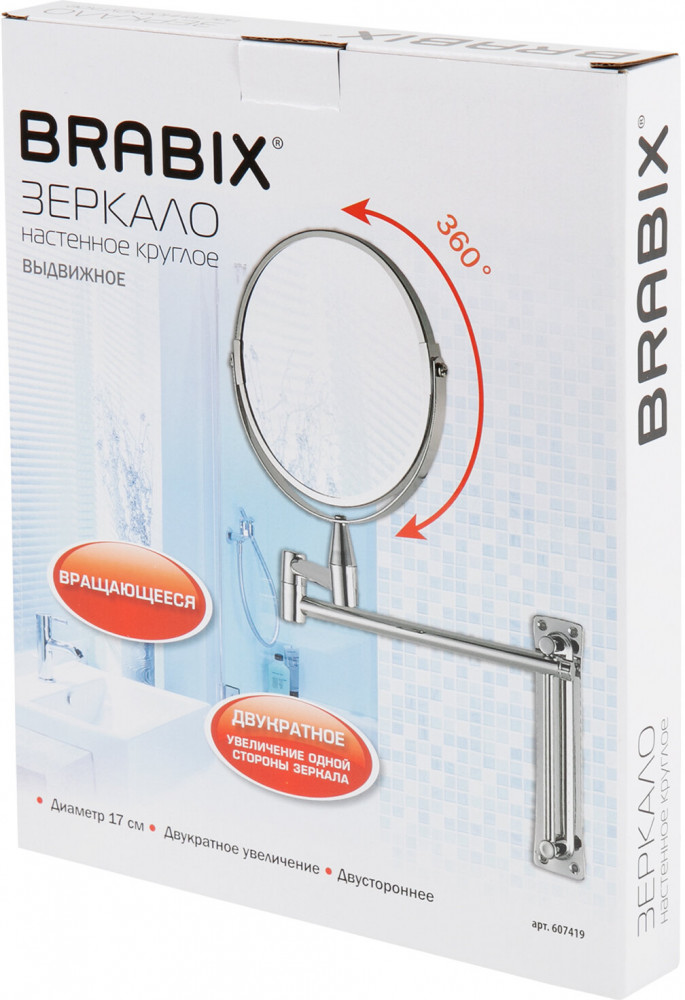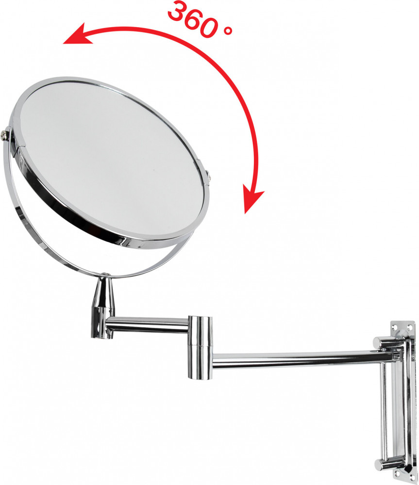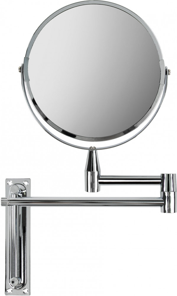 Эффект 2-х кратного увеличения позволит тщательно и аккуратно произвести самые сложные манипуляции в макияже. Также удобно для использования во время бритья. Зеркало поворачивается вокруг своей оси, что создает дополнительные удобства при использовании. Оправа выполнена из хромированной стали. Диаметр зеркала составляет 17 см.