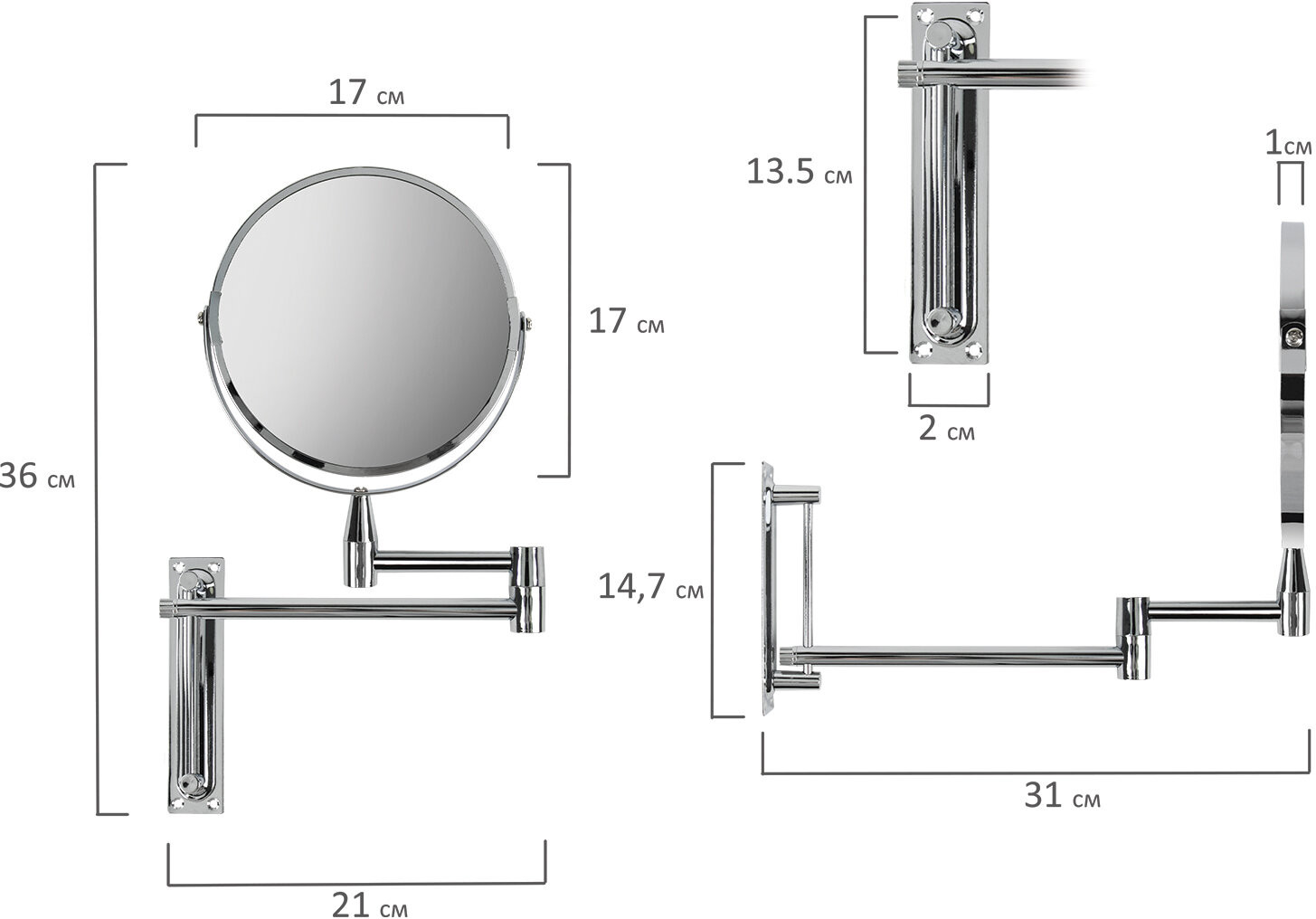 Настенное двустороннее зеркало станет отличным помощником в уходе за кожей, нанесении макияжа, проведении лечебных процедур для лица. С подробной детализацией размеров данного зеркала можно ознакомиться на одной из фотографий.