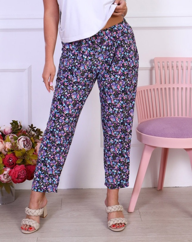 В жаркую погоду не душно. Комфортные брюки с весёлым растительным принтом на лето, для прогулок или на дачу.