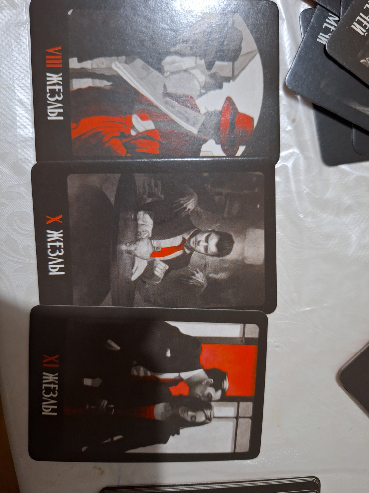 качество ужасно, сыпятся, Тасовать не удобно, прилипают, отсутствие 3 карт и 2 одинаковые (1 лишняя), отпечатка XI вместо XI, не удивлена, издание Лас играс в своем репертуаре.
