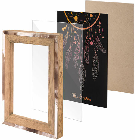 Рамка, выполненная из массива мангового дерева — благородного и эксклюзивного материала, также имеет декоративную вставку из акрила, имитирующую мрамор. За счет этого достигается идеальное сочетании классического и современного стилей. Рамка предназначена для фотографий размером 13×18 см. Ширина багета — 25 мм, высота — 15 мм. Имеется возможность вертикального и горизонтального подвеса. Вставка из акрила вместо обычного стекла делает рамку менее хрупкой.