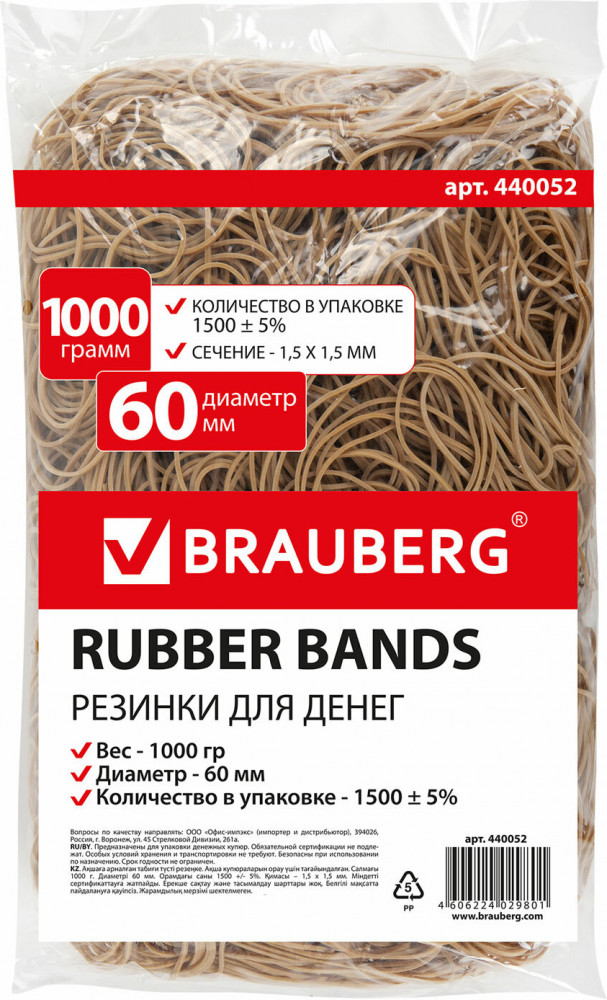 Благодаря натуральному каучуку они могут свободно растягиваться в несколько раз и мгновенно возвращаются к своему первоначальному диаметру, равному 60 мм. Толщина в 1,5 мм гарантирует прочность изделия. Вес — 1000 г, количества в упаковке около 1500 штук хватит на максимально продолжительное время. Цвет — натуральный.