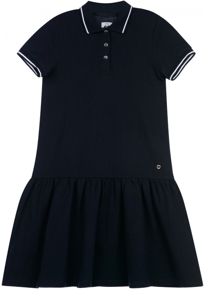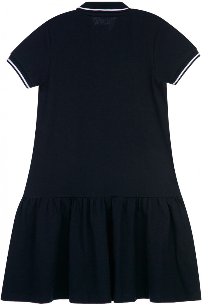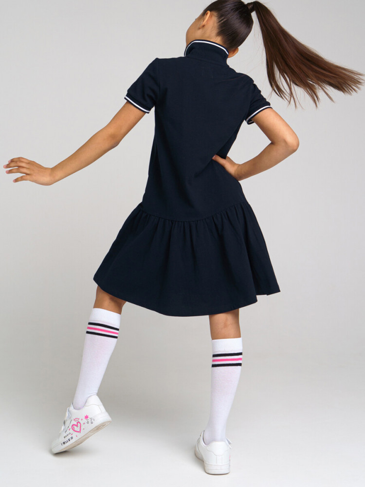 Платье — поло из полотна с переплетением пике. Высокое содержание хлопка 95%. Благодаря наличию эластана в составе ткани изделие проще в уходе и держит форму. По низу платья широкая оборка. Планка на кнопках.