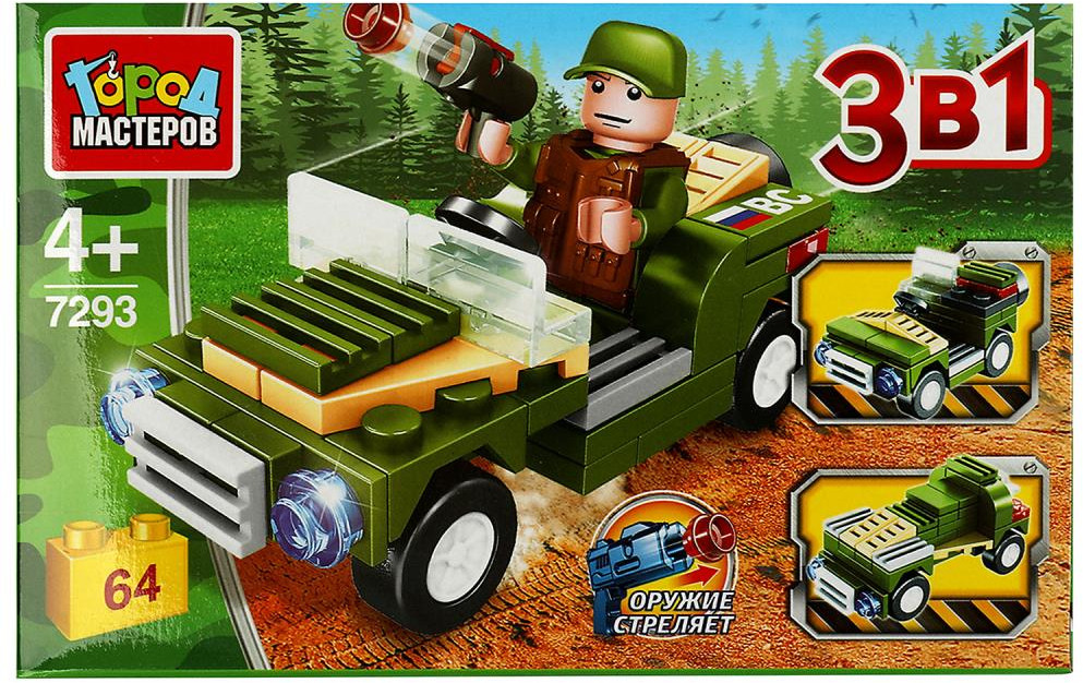 💳 Оплатить за товар можно при получении 🇰🇿 Есть бесплатная доставка по Казахстану 🎁 Копите бонусы с каждой покупки Серия: Армия Конструктор 3 в 1 «Солдат на джипе» ТМ «Город мастеров» понравится маленьким героям. |