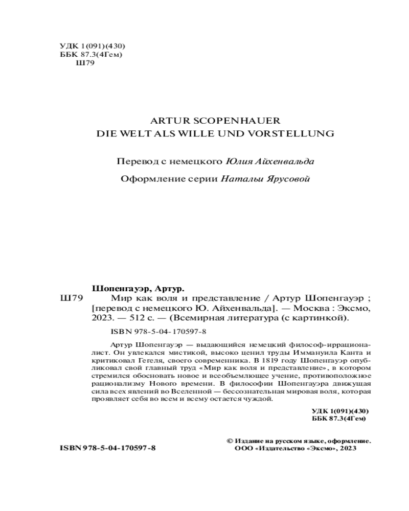 💳 Оплатить за товар можно при получении 🇰🇿 Есть бесплатная доставка по Казахстану от 1 дня 🎁 Копите бонусы с каждой покупки Серия: Всемирная литература (новое оформление) Артур Шопенгауэр — выдающийся немецкий философ-иррационалист. Он увлекался мистикой, высоко ценил труды Иммануила Канта и критиковал Гегеля, своего современника. В 1819 году Шопенгауэр опубликовал свой главный труд «Мир как воля и представление», в котором стремился обосновать новое и всеобъемлющее учение, противоположное рационализму Нового времени. В философии Шопенгауэра движущая сила всех явлений во Вселенной — бессознательная мировая воля, которая проявляет себя во всем и всему остается чуждой. |