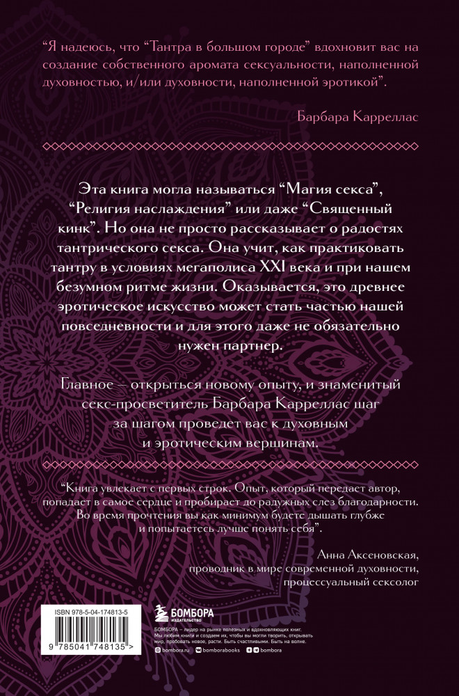 💳 Оплатить за товар можно при получении 🇰🇿 Есть бесплатная доставка по Казахстану от 1 дня 🎁 Копите бонусы с каждой покупки Серия: Камасутра XXI века для продвинутых Эта книга могла называться «Магия секса», «Религия наслаждения» или даже «Священный кинк». Но она не просто рассказывает о радостях тантрического секса. Она учит, как практиковать тантру в условиях мегаполиса XXI века и при нашем безумном ритме жизни. Оказывается, это древнее эротическое искусство может стать частью нашей повседневности, и для этого даже не обязательно нужен партнер. |