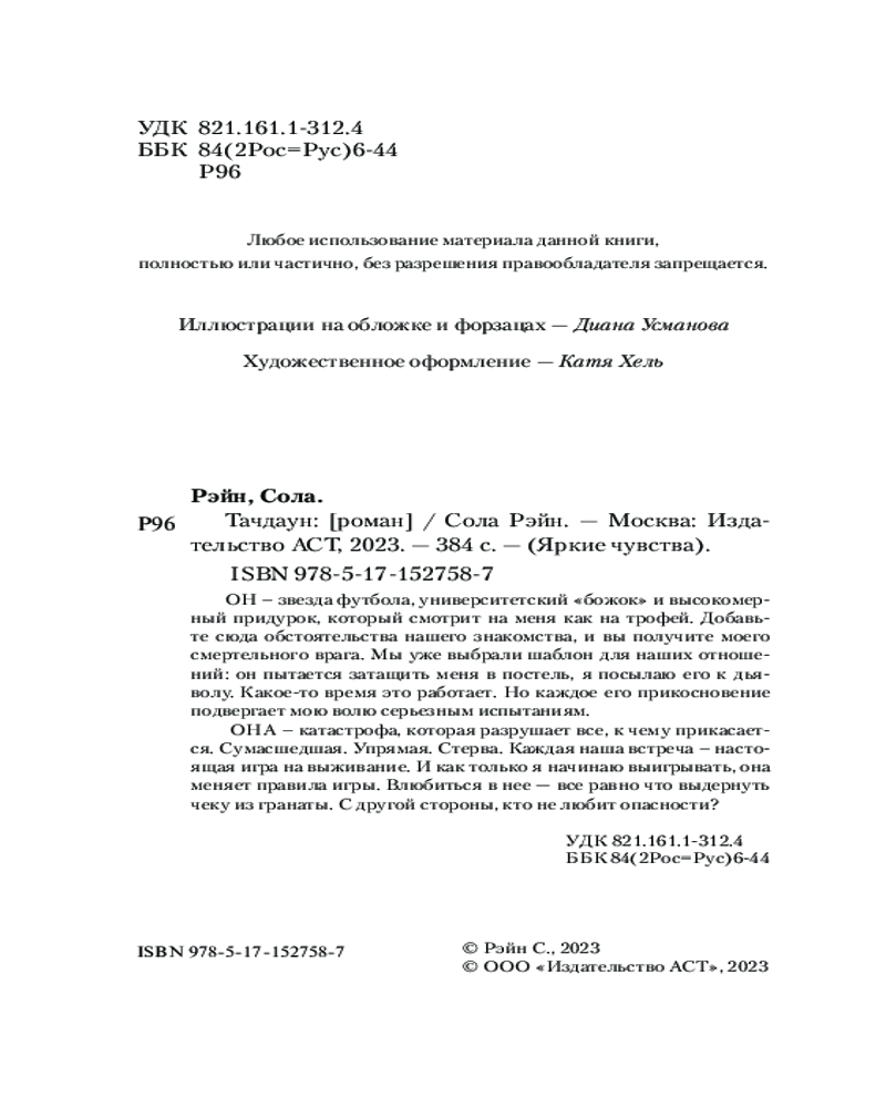💳 Оплатить за товар можно при получении 🇰🇿 Есть бесплатная доставка по Казахстану от 1 дня 🎁 Копите бонусы с каждой покупки Серия: Яркие чувства ОН — звезда футбола, университетский «божок» и высокомерный придурок, который смотрит на меня как на трофей. Добавьте сюда обстоятельства нашего знакомства, и вы получите моего смертельного врага. Мы уже выбрали шаблон для наших отношений: он пытается затащить меня в постель, я посылаю его к дьяволу. Какое-то время это работает. Но каждое его прикосновение подвергает мою волю серьезным испытаниям. |