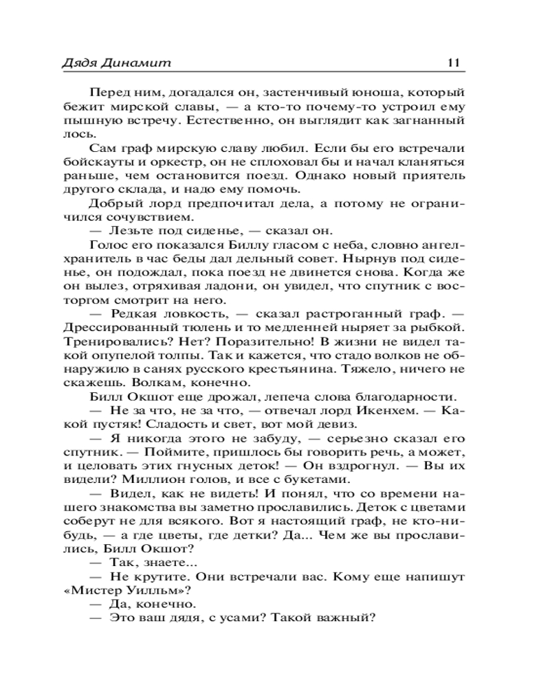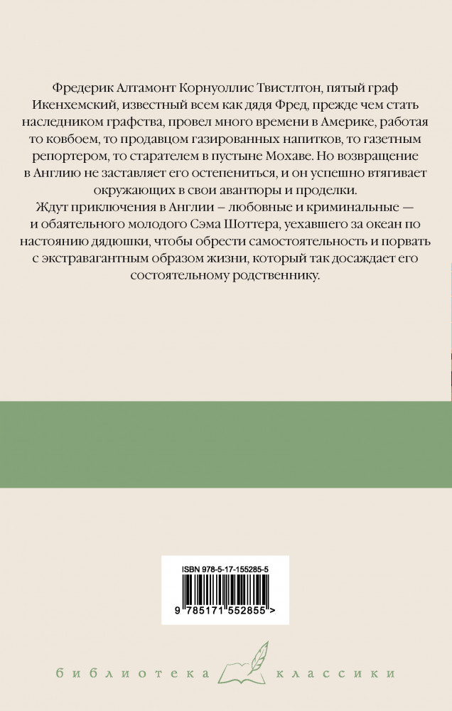 💳 Оплатить за товар можно при получении 🇰🇿 Есть бесплатная доставка по Казахстану от 1 дня 🎁 Копите бонусы с каждой покупки Серия: Библиотека классики Фредерик Алтамонт Корнуоллис Твистлтон, пятый граф Икенхемский, известный всем как дядя Фред, прежде чем стать наследником графства, провел много времени в Америке, работая то ковбоем, то продавцом газированных напитков, то газетным репортером, то старателем в пустыне Мохаве. Но возвращение в Англию не заставляет его остепениться, и он успешно втягивает окружающих в свои авантюры и проделки. |