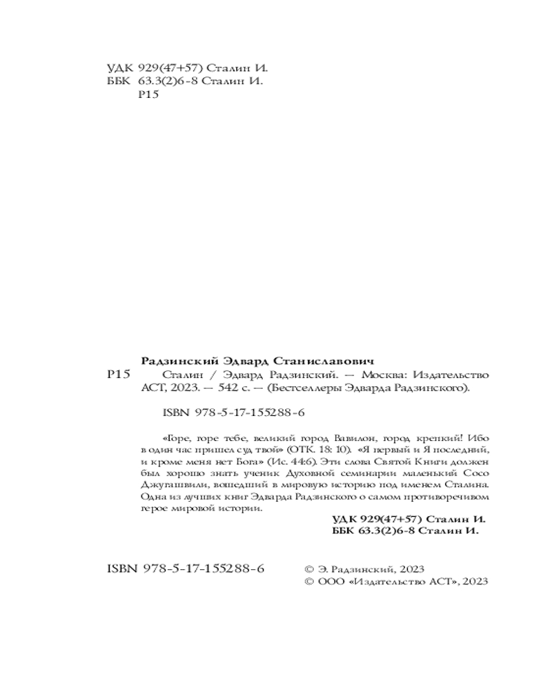 💳 Оплатить за товар можно при получении 🇰🇿 Есть бесплатная доставка по Казахстану от 1 дня 🎁 Копите бонусы с каждой покупки Серия: Бестселлеры Эдварда Радзинского «Горе, горе тебе, великий город Вавилон, город крепкий! Ибо в один час пришел суд твой» (ОТК. 18: 10). «Я первый и Я последний, и кроме меня нет Бога» (Ис. 44:6). Эти слова Святой Книги должен был хорошо знать ученик Духовной семинарии маленький Сосо Джугашвили, вошедший в мировую историю под именем Сталина. Одна из лучших книг Эдварда Радзинского о самом противоречивом герое мировой истории в новой серии «Бестселлеры Эдварда Радзинского». |