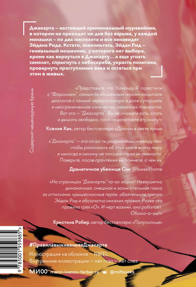 Правила выживания в Джакарте. Подарочное изданиеВ данный момент этот товар отсутствует в продаже. Возможно, у нас найдется аналогичный или похожий товар здесь. Серия: Red Violet. Экшен-комедия Джакарта — настоящий криминальный муравейник, в котором не происходит ни дня без взрыва, у каждой монашки — по два пистолета и все ненавидят Эйдана Рида. Кстати, знакомьтесь, Эйдан Рид — гениальный мошенник, у которого нет выбора, кроме как вернуться в Джакарту... а еще угнать самолет, спрыгнуть с небоскреба, украсть политика, провернуть преступление века и остаться при этом в живых. |