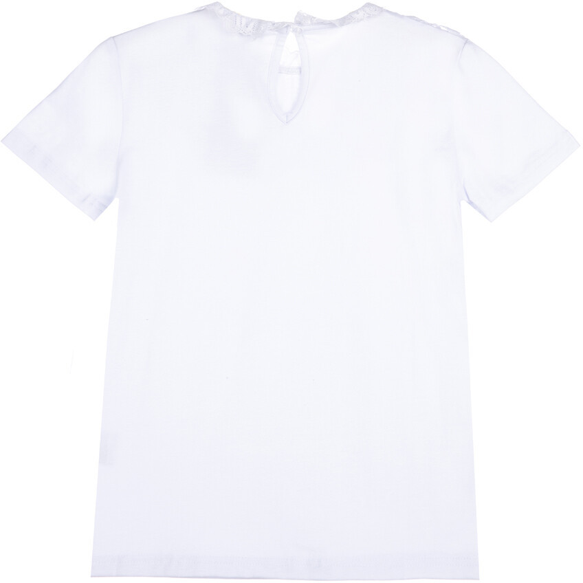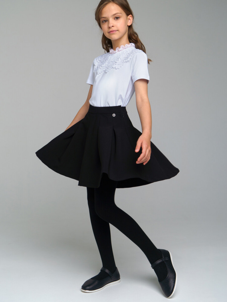Блузка трикотажная из качественного и приятного на ощупь трикотажа. Высокое содержание хлопка 95%. Благодаря наличию эластана в составе ткани, изделие проще в уходе и держит форму. Полуприлегающий силуэт. Полочка декорирована кружевом. Застежка на спинке на пуговицу.