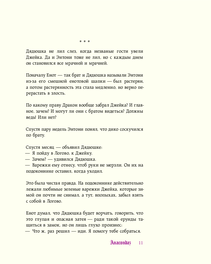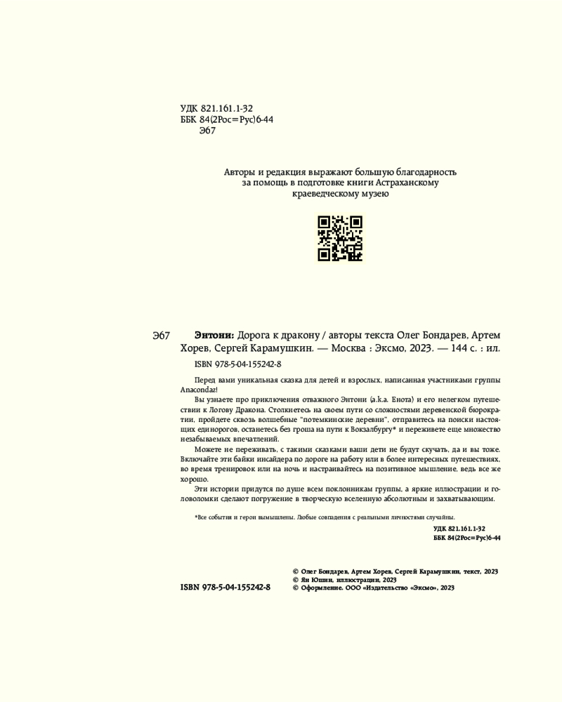 💳 Оплатить за товар можно при получении 🇰🇿 Есть бесплатная доставка по Казахстану 🎁 Копите бонусы с каждой покупки Серия: Сказки от Anacondaz Перед вами уникальная сказка для детей и взрослых, написанная участниками группы Anacondaz! Вы узнаете про приключения отважного Энтони (a.k.a. Енота) и его нелегком путешествии к Логову Дракона. Столкнетесь на своем пути со сложностями деревенской бюрократии, пройдете сквозь волшебные «потемкинские деревни», отправитесь на поиски настоящих единорогов, останетесь без гроша на пути к Вокзалбургу и переживете еще множество незабываемых впечатлений. |