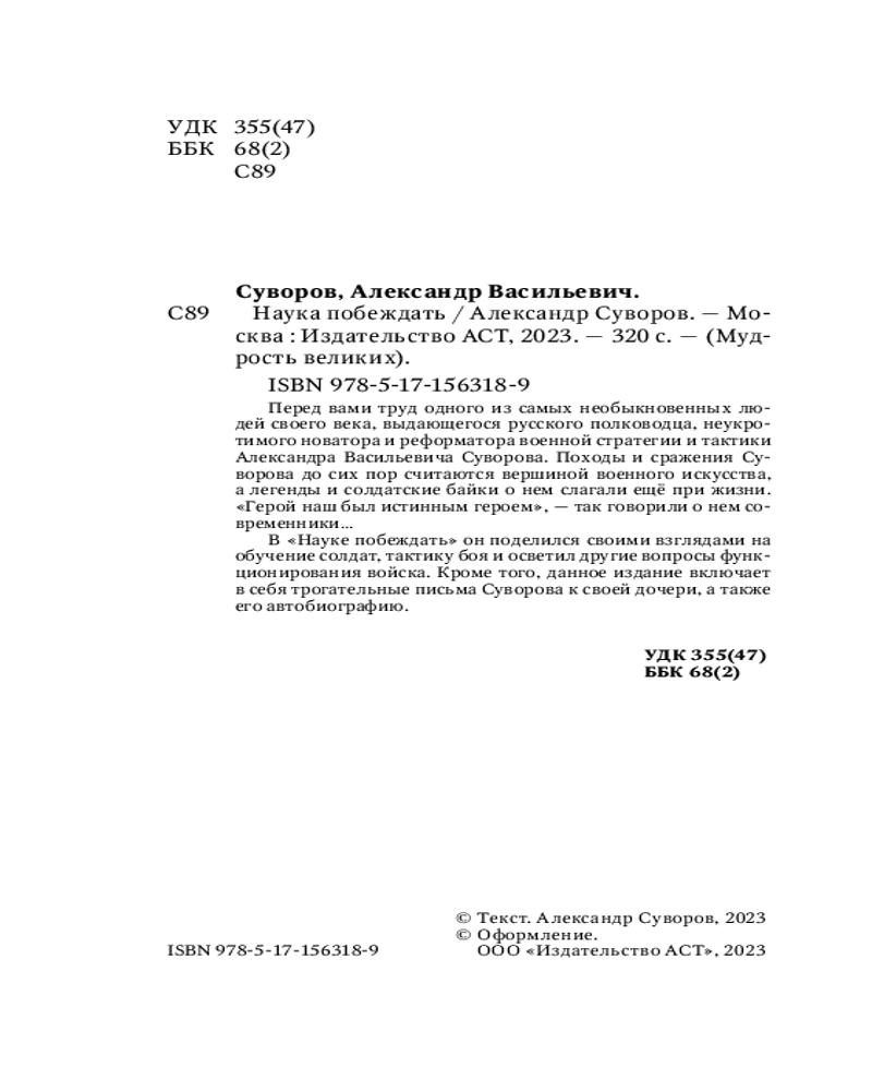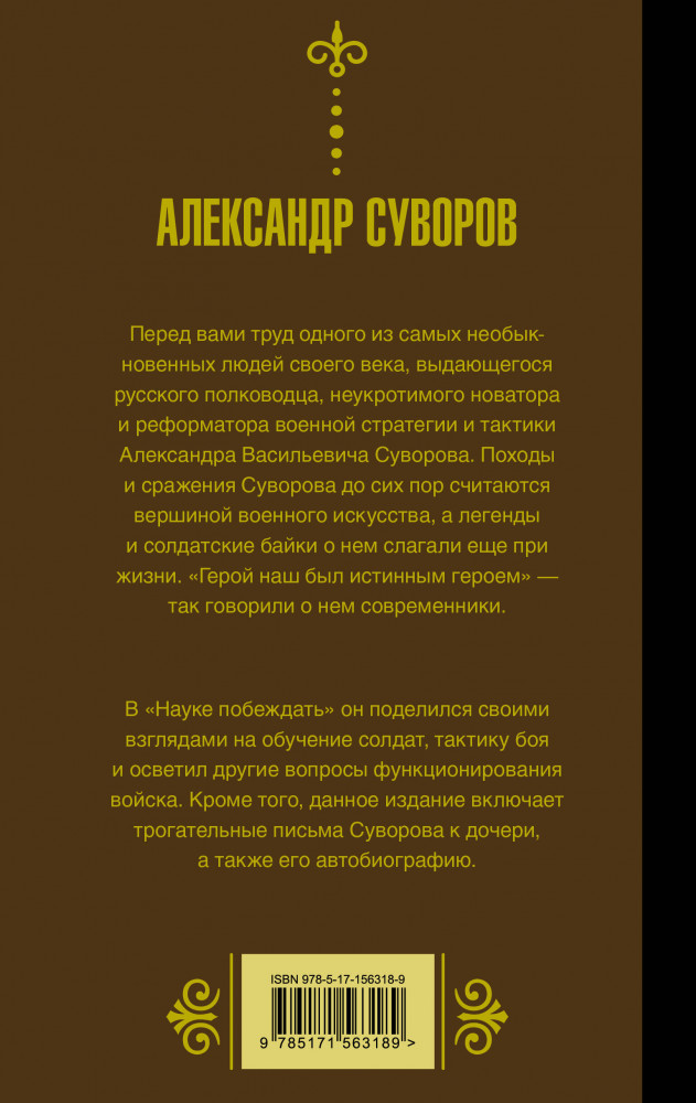 💳 Оплатить за товар можно при получении 🇰🇿 Есть бесплатная доставка по Казахстану от 1 дня 🎁 Копите бонусы с каждой покупки Серия: Мудрость великих Перед вами труд одного из самых необыкновенных людей своего века, выдающегося русского полководца, неукротимого новатора и реформатора военной стратегии и тактики Александра Васильевича Суворова. Походы и сражения Суворова до сих пор считаются вершиной военного искусства, а легенды и солдатские байки о нем слагали ещё при жизни. «Герой наш был истинным героем», — так говорили о нем современники... |