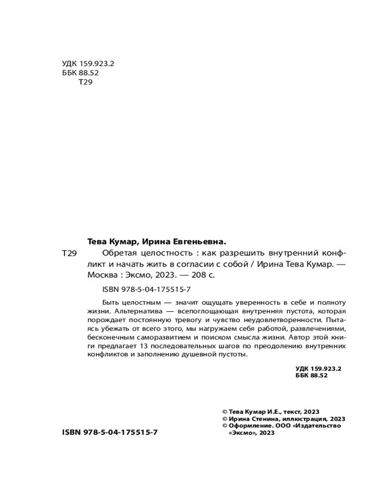 💳 Оплатить за товар можно при получении 🇰🇿 Есть бесплатная доставка по Казахстану от 1 дня 🎁 Копите бонусы с каждой покупки Серия: Top expert. Практичные книги для работы над собой Ирина Тева Кумар — интегративный психолог, преподаватель Московского института психоанализа. На ее счету более 10 000 консультаций. |