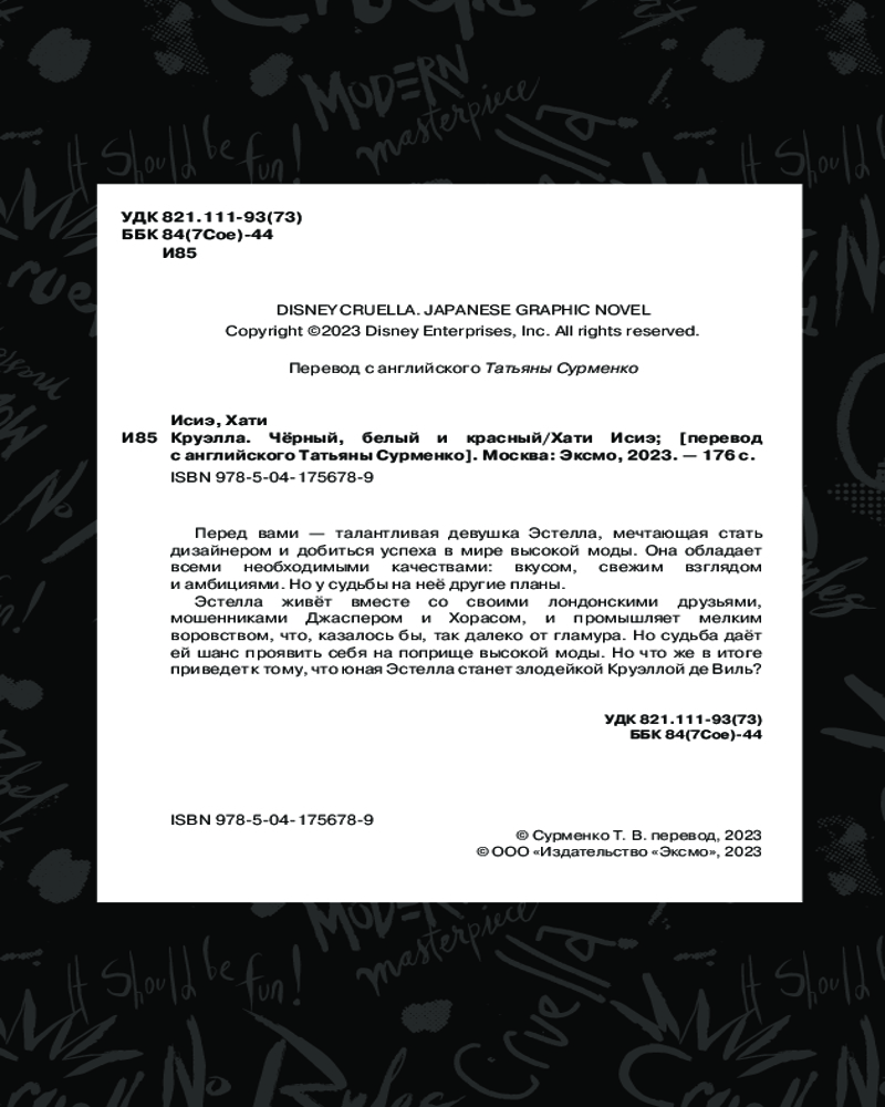 💳 Оплатить за товар можно при получении 🇰🇿 Есть бесплатная доставка по Казахстану от 1 дня 🎁 Копите бонусы с каждой покупки Серия: Disney. Манга Задумывались ли вы о том, какой была история злодейки Круэллы де Виль? Талантливая Эстелла мечтает покорить мир высокой моды. После очередных проблем в школе девушка вместе с матерью переезжает в Лондон, где знакомится с уличными мошенниками Джаспером и Хорасом. Промышляя воровством, Эстелла не оставляет надежд стать дизайнером и устраивается на работу в модный универмаг. Там на нее обращает внимание богатая и высокомерная баронесса фон Хельман. Теперь жизнь Эстеллы меняется навсегда. |