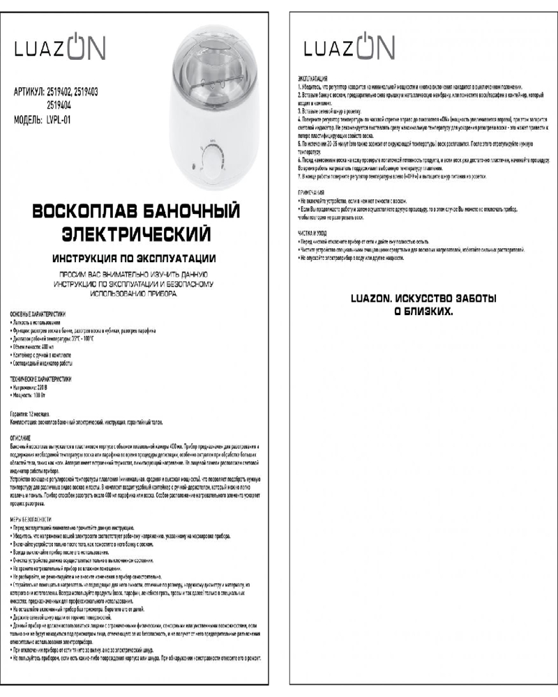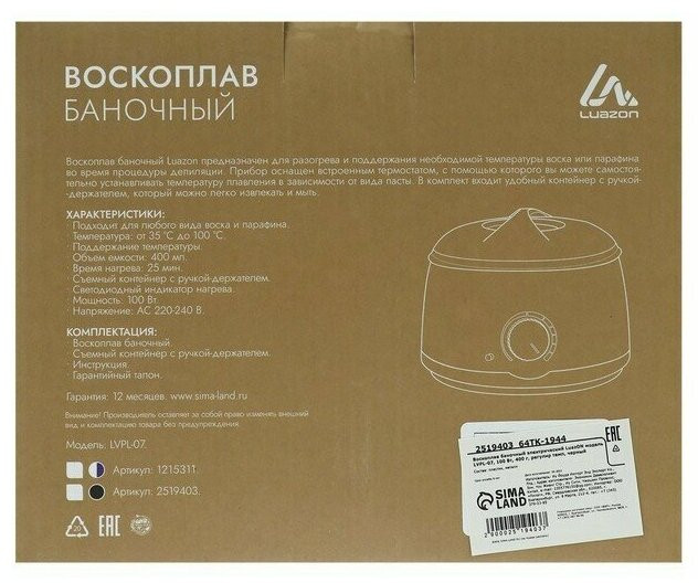 LuazON LVPL-07, баночный, 100 Вт, 400 г, регулировка температуры, 220 В, черный Баночный воскоплав Luazon предназначен для разогревания и поддержания необходимой температуры воска или парафина во время процедуры депиляции.
