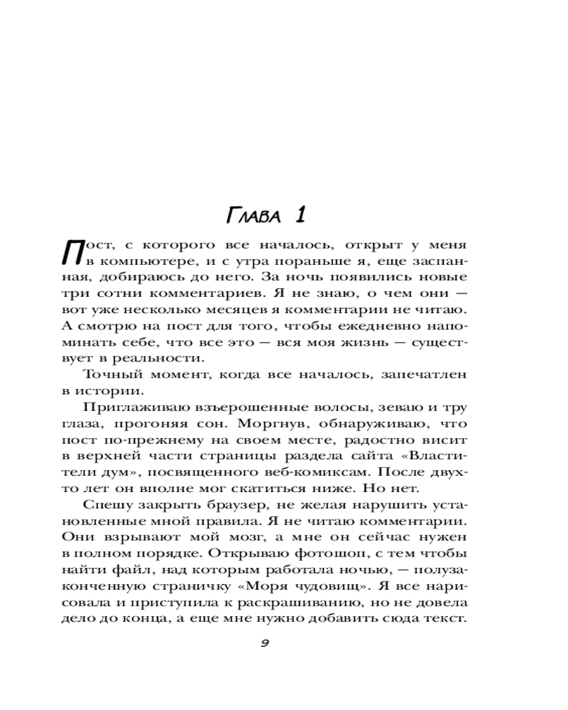 Мне понравилась эта история, хотя в начале не зацепила. Много рисуночков, но я не поняла, и не вникала в персонажей «Моря чудовищ». Элиза была социофобом, и ей трудно общатся в жизни. Короче хорошая книга