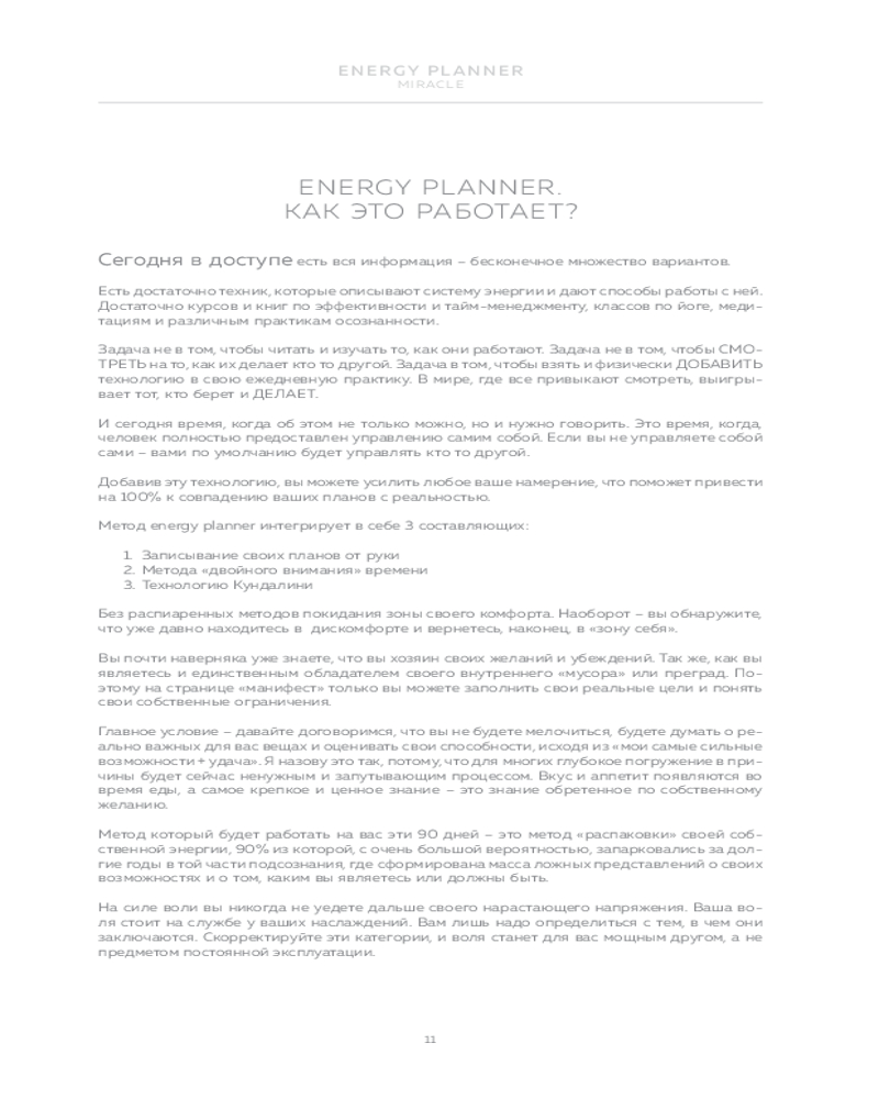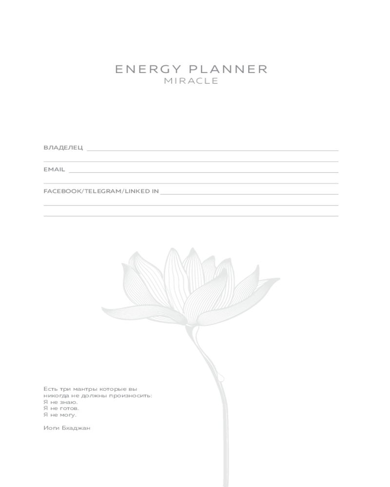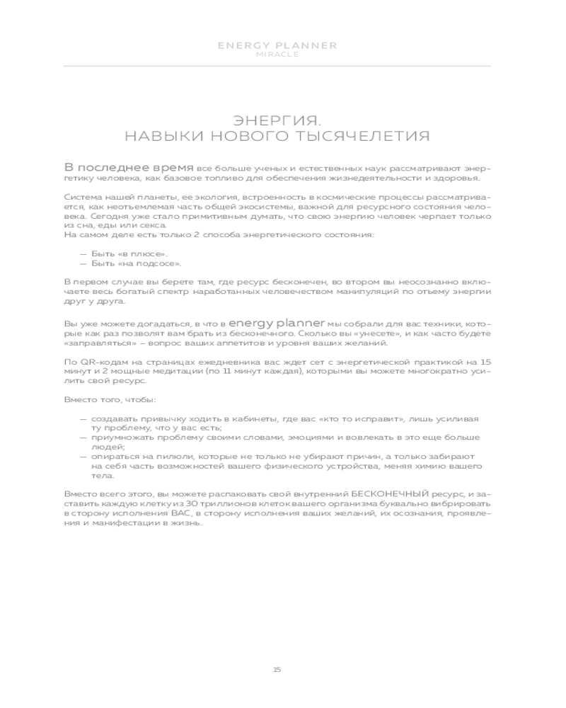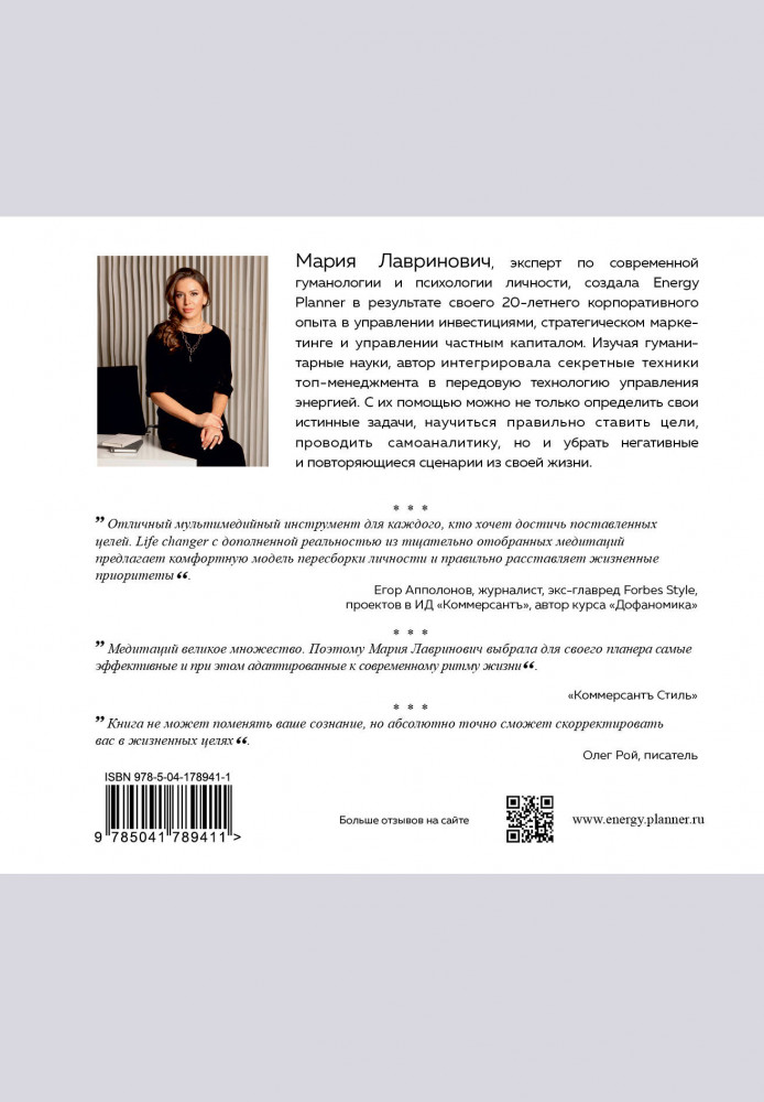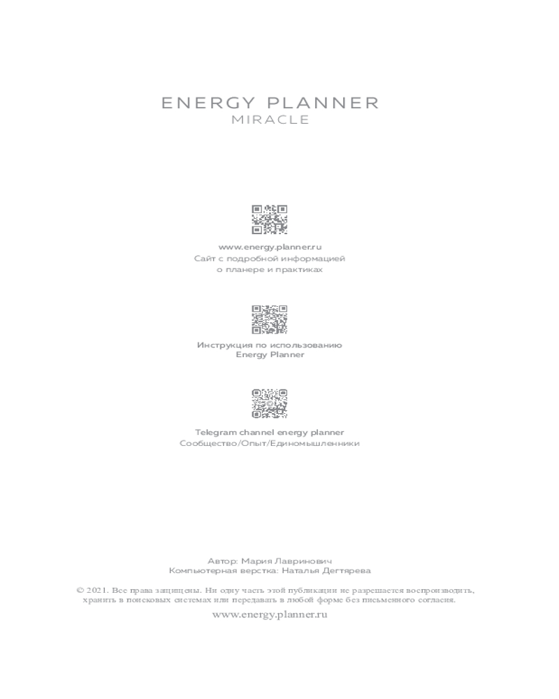 Планер для уверенности и реализации желаний «Energy Planner. Miracle»В данный момент этот товар отсутствует в продаже. Возможно, у нас найдется аналогичный или похожий товар здесь. Energy planner — это ежедневники нового поколения, которые дают человеку четкую систему, как самостоятельно привести свою жизнь в полный порядок, систематизировать свои цели и желания, согласно своему предназначению. Автор, Мария Лавринович, интегрировала техники топ-менеджмента для фокуса и внимания, систему самоанализа и психологические тесты, добавив главный двигатель любых перемен — мощные энергетические практики, на которые ведут QR-коды планера. |