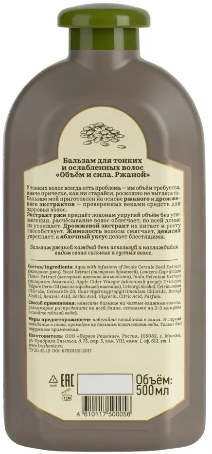 Рецепты Бабушки Агафьи Бальзам для волос «Объём и сила. Ржаной»-20% +52 приятный запах большой объём увлажняет волосы лёгкое расчёсывание
