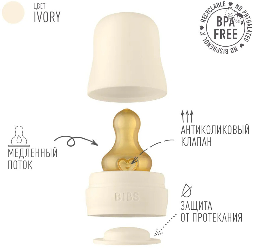 Самый чистый и 100% безопасный материал. Бутылочка изготовлена из боросиликатного стекла — это самый чистый материал для еды и напитков, он не выделяет никаких вредных веществ в молоко/смеси. Соска сделана из мягкого натурального каучука (сок дерева гевея). Все пластиковые части изготовлены из экологичных пищевых пластиков, подлежащих переработке.