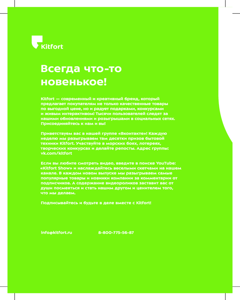 Российский бренд Kitfort занимает лидирующие позиции на рынке бытовой техники для кухни и дома. Основанная в 2011 году в городе Санкт-Петербурге, компания Kitfort стремится предоставить своим клиентам передовые технологии и инновационные решения для повседневных задач и создания комфортного пространства в доме.