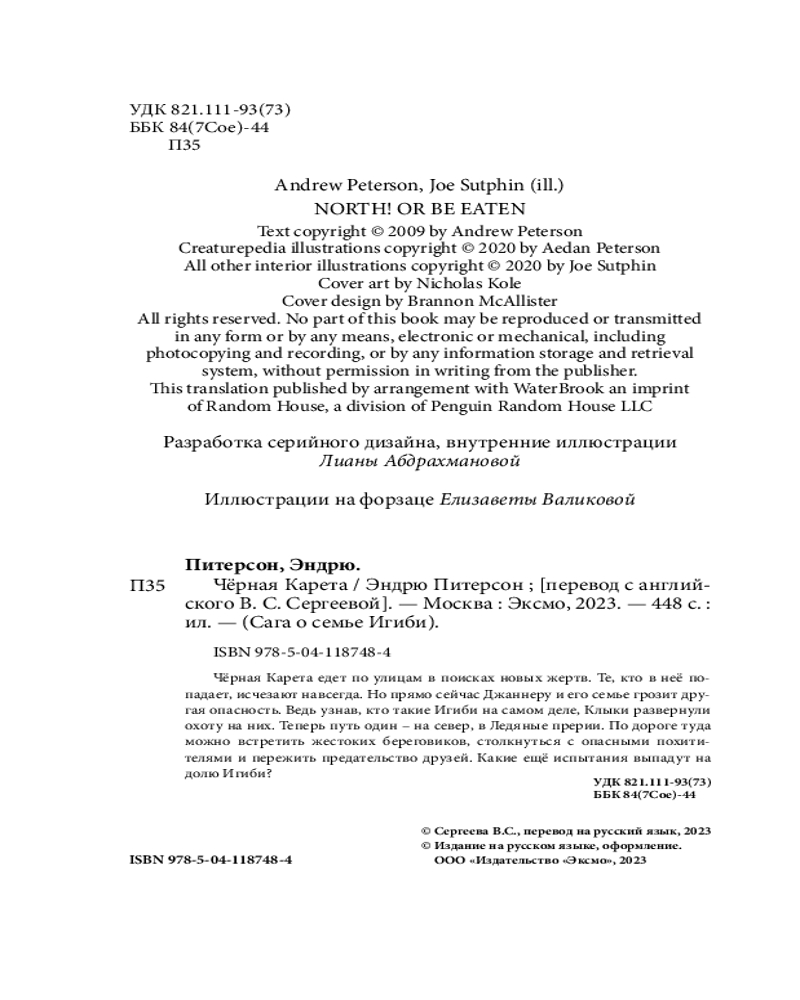 💳 Оплатить за товар можно при получении 🇰🇿 Есть бесплатная доставка по Казахстану от 1 дня 🎁 Копите бонусы с каждой покупки Серия: Детск. Сага о семье Игиби Теперь путь только один — на север! После того, как Клыки узнали, что Джаннер, Лили и Тинк — наследники Анниеры, загадочного исчезнувшего королевства, они развернули охоту на них. И спастись семья Игиби может только в Ледяных прериях. Однако по дороге туда легко встретить новых врагов: здесь поджидают опасные береговики, обитатели тёмных подземных туннелей и разъярённые морские драконы... А тем временем таинственная Чёрная Карета ищет новых жертв. И ей может стать даже наследник трона. |