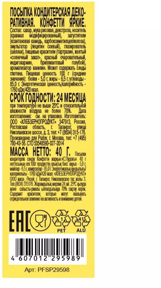 С.Пудовъ Посыпка «Конфетти»В данный момент этот товар отсутствует в продаже. Возможно, у нас найдется аналогичный или похожий товар здесь. Яркая кондитерская посыпка «Конфетти яркие» поможет создать оригинальный декор на тортах, пирожных, печенье, кексах, маффинах и пасхальных куличах. Посыпка прекрасно подходит для оформления мороженого, молочных коктейлей, домашних конфет и других десертов, которые не требуют выпечки. Каждый кондитер и кулинар, профессионал или домашний мастер хотят придать собственным десертам и домашней выпечке уникальный авторский почерк и индивидуальность. Посыпка «Конфетти яркие» с легкостью поможет это сделать. |
