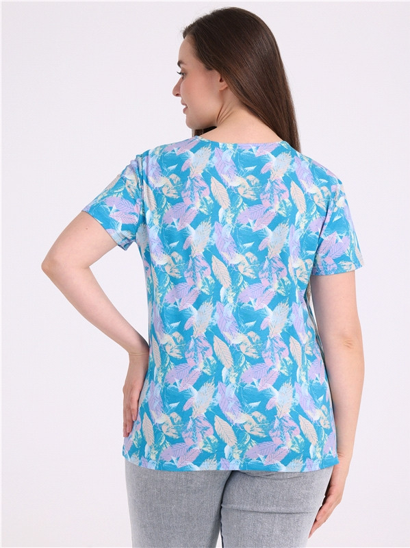 Футболка выполнена из кулира — легкого хлопкового полотна. Изделие свободного покроя с короткими рукавами и округлым вырезом горловины.