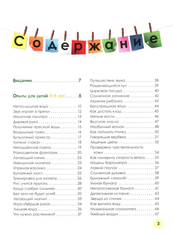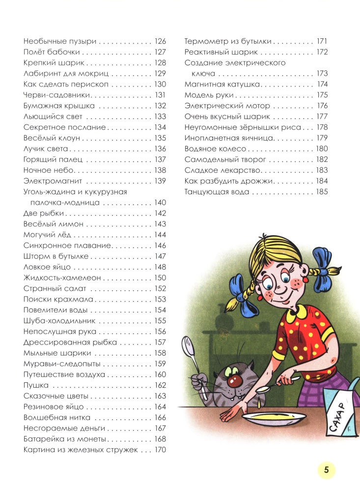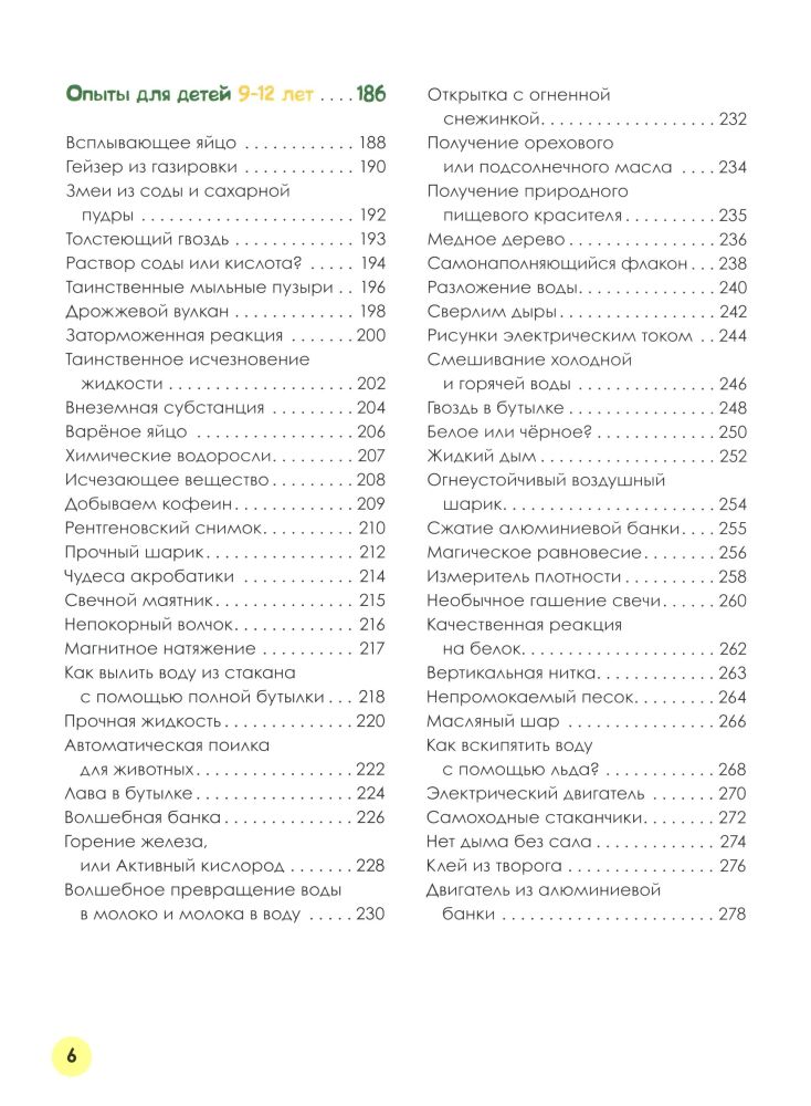 Представлено много разнообразных опытов, проделывать которые ребенок может как самостоятельно, так и со взрослыми. В книге подробно дано описание того, что нужно сделать, сколько это займет времени (есть опыты и по неделям, и рассчитанные на долгое наблюдение, есть пятиминутные). Также опыты разделяются по возрастной категории, все это представлено в отдельных главах.