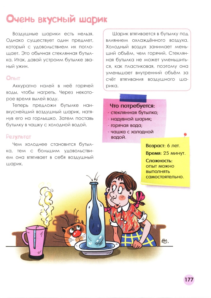 Мой семилетний сын теперь ходит хвостом и просит то буру в глицерине, то бутылку из под вина с пробкой, то яйцо и уксус... Пару опытов уже сделали вместе: не сложно, обычно, все необходимое дома найти можно, а уж как интересно ребенку, не передать. Надо видеть удивленную детскую мордаху, когда варенное яйцо вдруг проскальзывает в бутылочное горлышко.
