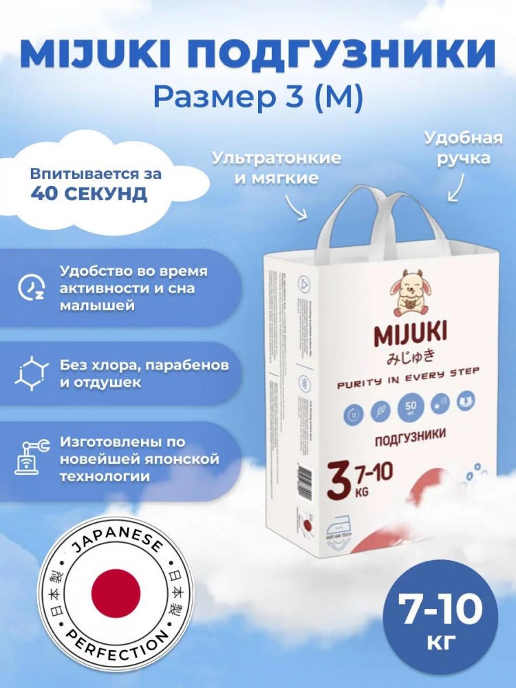 Ультратонкие подгузники для детей изготовлены по инновационной японской технологии без добавления целлюлозы и сертифицированы о соответствии безопасности детской гигиены. В роли наполнителя используется premium-суперабсорбент (SAP) японского производства, экологически чистый нетканый материал. Он, в отличие от целлюлозы, не возвращает влагу при сдавливании. Технология Hot Air Tech позволяет добиться максимальной мягкости. А значит нежная кожа вашего малыша под надежной ultra-защитой от раздражения. В процессе производства подгузников не использованы ароматизаторы, парабены, хлор, фталаты или консерванты. Они идеально подходят для девочек и мальчиков, новорожденному ребенку. Мидзуки — это качественные детские товары для новорожденных и счастливых родителей.