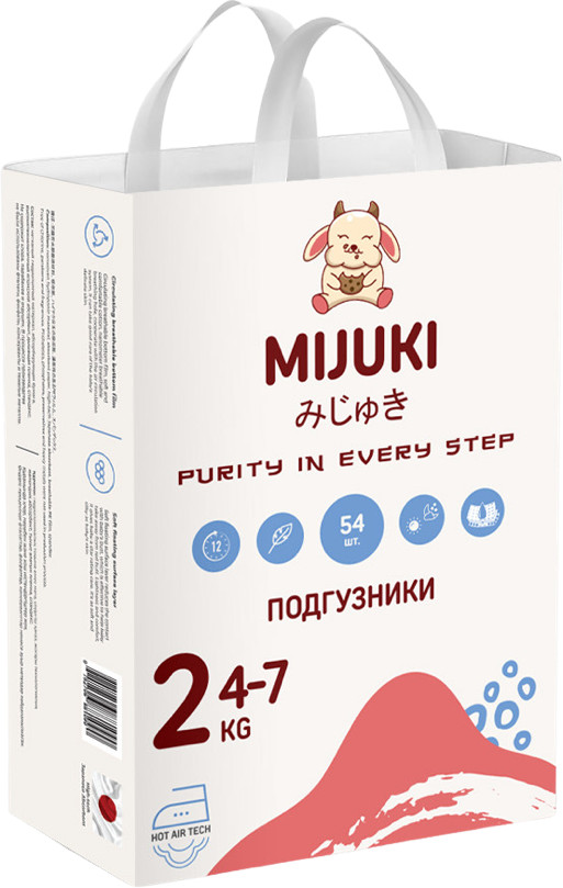 Ультратонкие подгузники для детей изготовлены по инновационной японской технологии без добавления целлюлозы и сертифицированы о соответствии безопасности детской гигиены. В роли наполнителя используется premium-суперабсорбент (SAP) японского производства, экологически чистый нетканый материал. Он, в отличие от целлюлозы, не возвращает влагу при сдавливании. Технология Hot Air Tech позволяет добиться максимальной мягкости. А значит нежная кожа вашего малыша под надежной ultra-защитой от раздражения. В процессе производства подгузников не использованы ароматизаторы, парабены, хлор, фталаты или консерванты. Они идеально подходят для девочек и мальчиков, новорожденному ребенку. Мидзуки — это качественные детские товары для новорожденных и счастливых родителей.