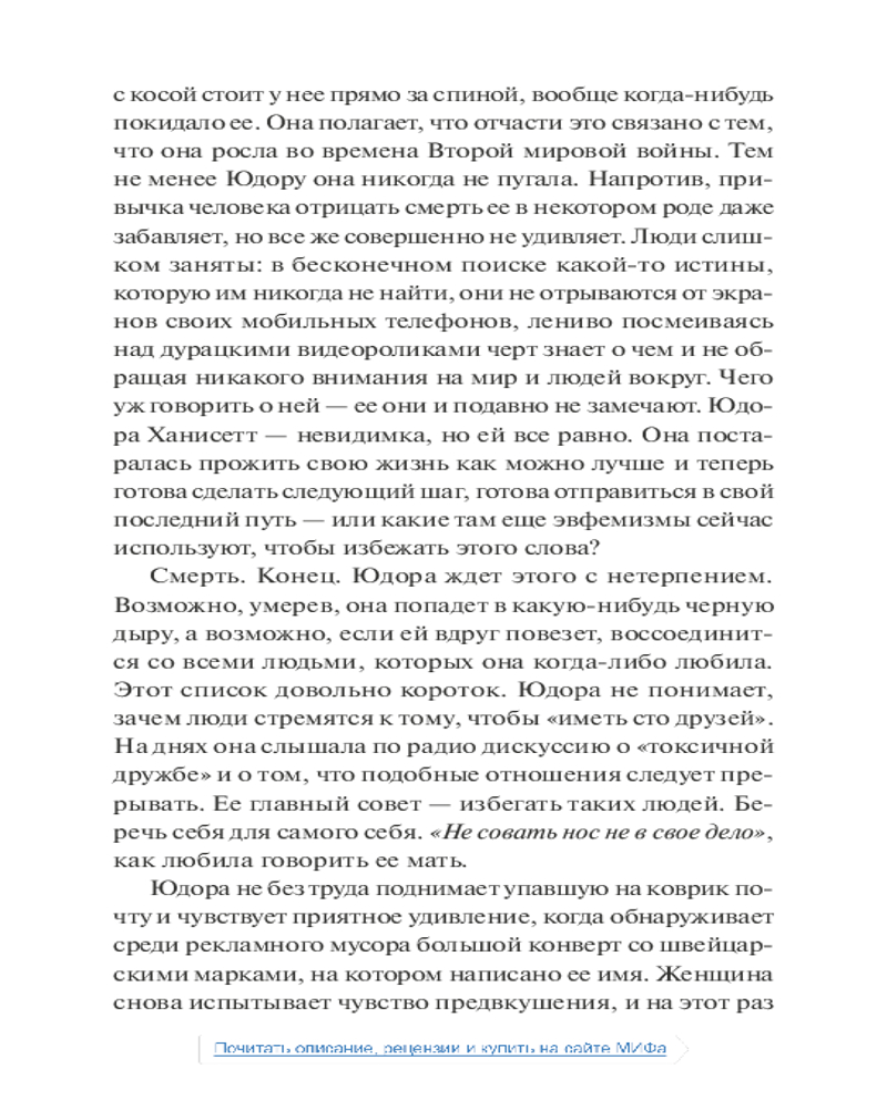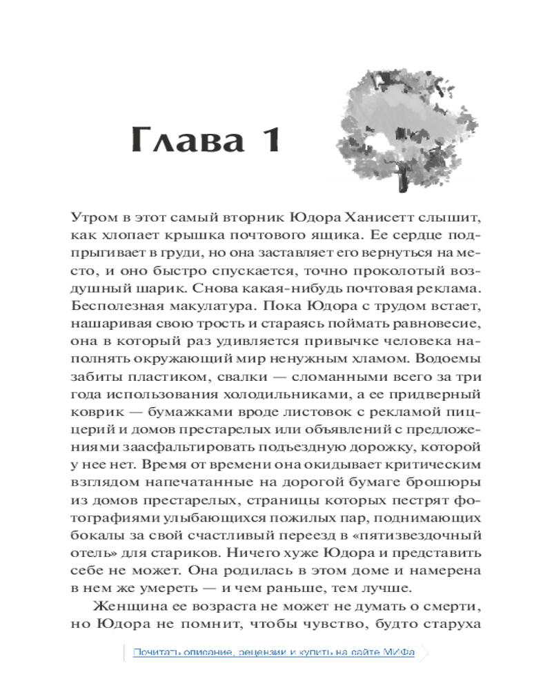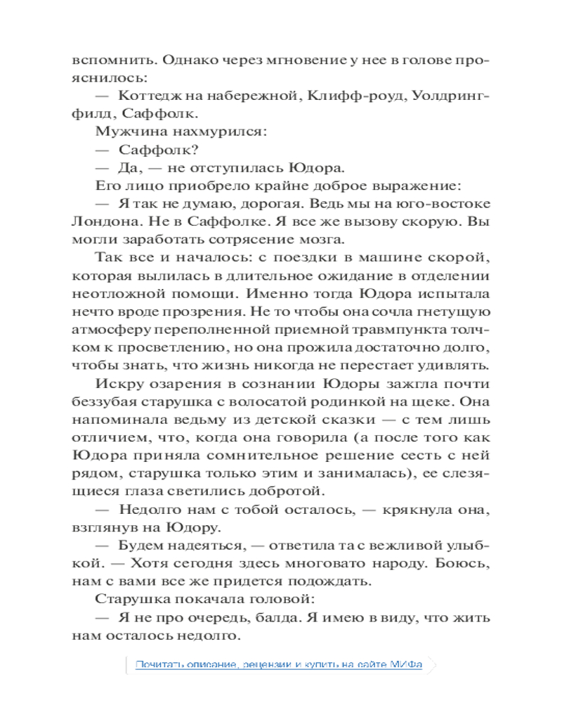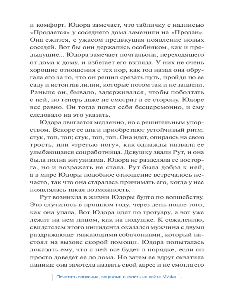 Женщина ее возраста не может не думать о смерти, но Юдора не помнит, чтобы чувство, будто старуха с косой стоит у нее прямо за спиной, вообще когда- нибудь покидало ее. Она полагает, что отчасти это связано с тем, что она росла во времена Второй мировой войны. Тем не менее Юдору она никогда не пугала.