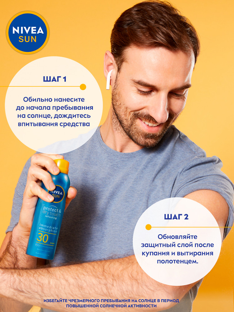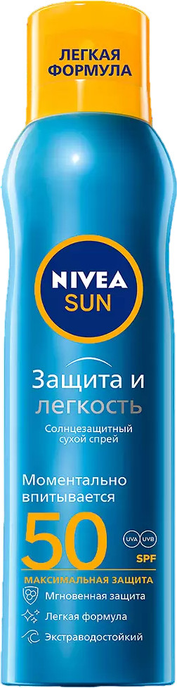 NIVEA Спрей солнцезащитный освежающий SPF50В данный момент этот товар отсутствует в продаже. Возможно, у нас найдется аналогичный или похожий товар здесь. Серия: Sun Попробуйте сухой солнцезащитный спрей Защита и Легкость SPF 50 от Nivea Sun. |