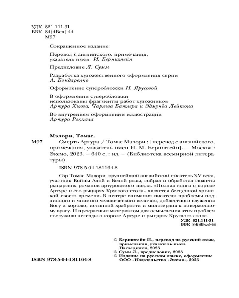 Смерть АртураВ данный момент этот товар отсутствует в продаже. Возможно, у нас найдется аналогичный или похожий товар здесь. Серия: Библиотека Всемирной Литературы Сэр Томас Мэлори, крупнейший английский писатель ХV века, участник войны Алой и Белой розы, собрал и обработал сюжеты рыцарских романов артуровского цикла. «Полная книга о короле Артуре и его рыцарях Круглого Стола» является бесценной хроникой своего времени. В центре внимания писателя проблемы подлинного и мнимого человеческого величия, доблестного служения Богу и королю, истинной храбрости и милосердия к поверженному врагу. И прекрасным материалом для осмысления этих проблем послужили легенды о короле Артуре и рыцарях Круглого Стола. |