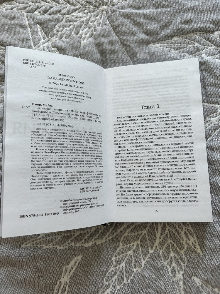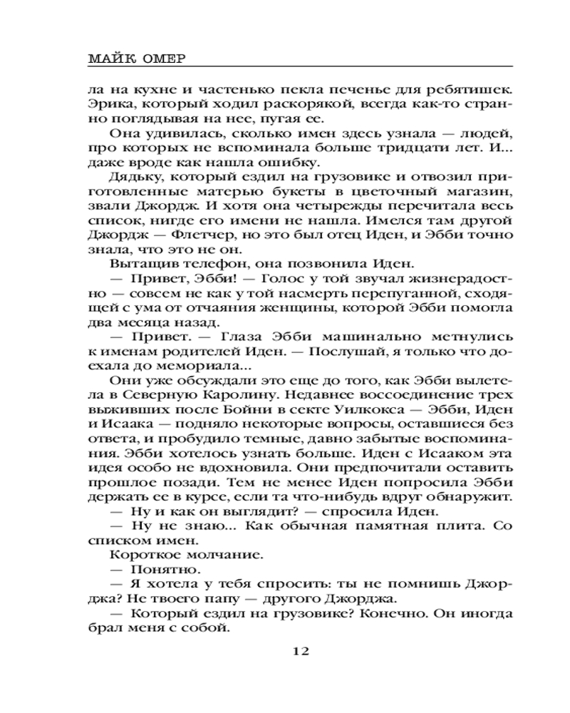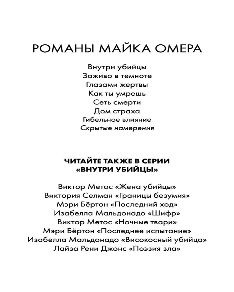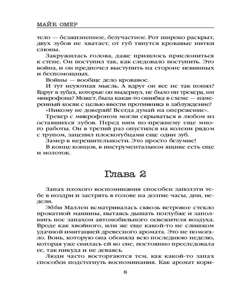 Взяла эту книгу лишь из за автора,не читая описания,главное что Майк Омер! Классная книга,как всегда написана очень круто,но до предыдущих книг автора не дотягивает,более нудный,но к середине уже втягиваешься и к концу опять таки интрига🤩
