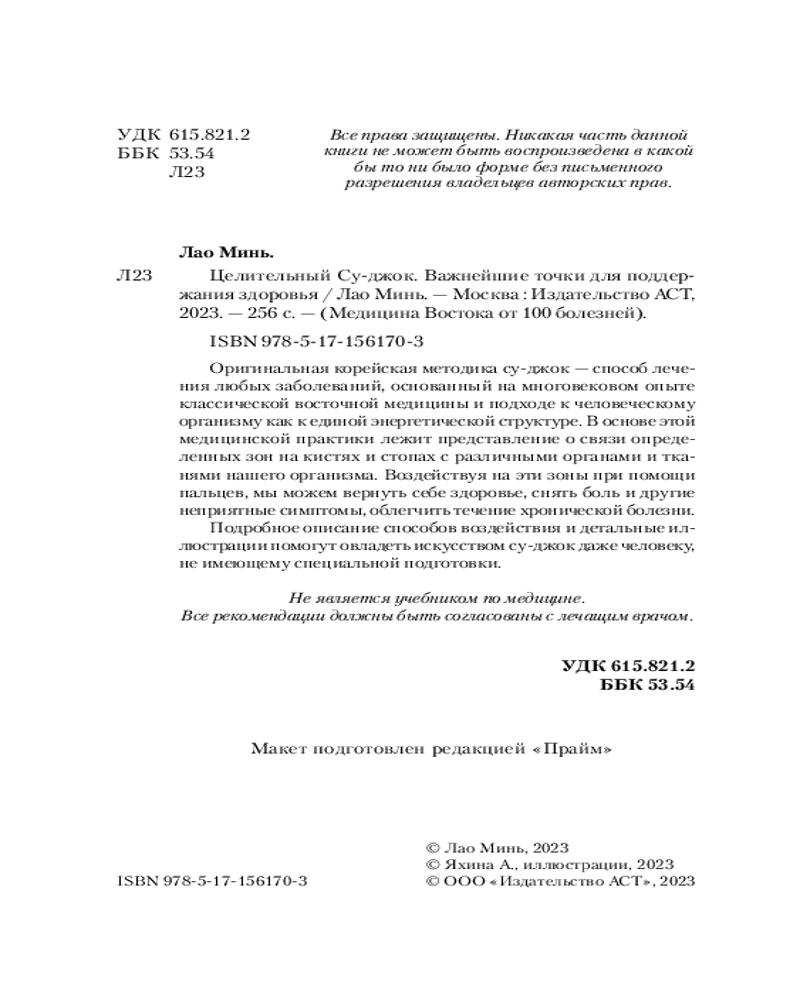 💳 Оплатить за товар можно при получении 🇰🇿 Есть бесплатная доставка по Казахстану 🎁 Копите бонусы с каждой покупки Серия: Медицина Востока от 100 болезней Книга Лао Миня, специалиста по восточным оздоровительным практикам, — это подробное руководство по целительному воздействию на особые зоны на стопах и ладонях, посредством чего можно улучшить работу всех органов и систем организма. Оригинальная корейская методика су-джок поможет укрепить иммунитет, справиться со стрессом, ускорить избавление от самых разных недугов и облегчить состояние при хронических недомоганиях. |