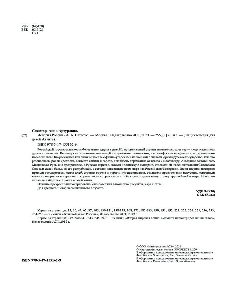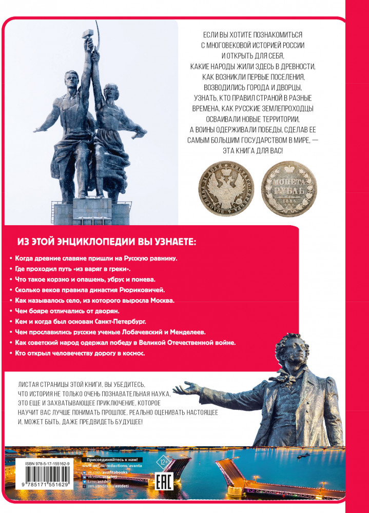 История РоссииВ данный момент этот товар отсутствует в продаже. Возможно, у нас найдется аналогичный или похожий товар здесь. Серия: Энциклопедия для детей Аванта Российской государственности более одиннадцати веков. Но история страны значительно древнее — люди жили здесь десятки тысяч лет. Поэтому книга знакомит читателей и с древними охотниками, и со скифскими всадниками, и с греческими поселенцами. Она расскажет, как славяне вместе с финно-угорскими племенами основали Древнерусское государство, как оно развивалось, росли крепости, а вместе с ними и города, как власть переходила от Киева к Владимиру. А позднее возвысилась Московская Русь, она превратилась в Русское царство, затем в Российскую империю, стала одной из основательниц Советского Союза и самой большой его республикой, а сегодня известна во всем мире как Российская Федерация. Люди творили историю: правили государством, сеяли хлеб, строили города и дороги, путешествовали, создавали произведения искусства, совершали научные открытия и первыми покорили космос, сражались и побеждали, сделав страну крупнейшей в мире. И все это читатель найдет на страницах этой книги. |