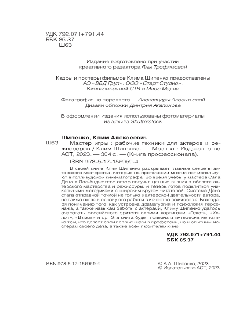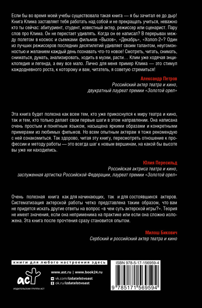 💳 Оплатить за товар можно при получении 🇰🇿 Есть бесплатная доставка по Казахстану от 1 дня 🎁 Копите бонусы с каждой покупки Серия: Книга профессионала В своей книге Клим Шипенко раскрывает главные секреты актерского мастерства, которые на протяжении многих лет используют в голливудском кинематографе. Во время учебы у мастера Сала Дано в Лос-Анджелесе автор получил ценные знания в области актерского мастерства и режиссуры, и теперь готов поделиться уникальными методиками с широким кругом читателей. Система Дано стала отправной точкой не только в актерской деятельности автора, но также легла в основу его работы в качестве режиссера. Благодаря пониманию того, как устроена драматургия и психология персонажа, а также навыкам работы с актерами, Климу Шипенко удалось очаровать российского зрителя своими картинами «Текст», «Холоп», «Вызов» и др. Эта книга будет полезна и интересна не только тем, кто делает свои первые шаги в профессии, но и опытным мастерам своего дела, а также всем любителям кино. |
